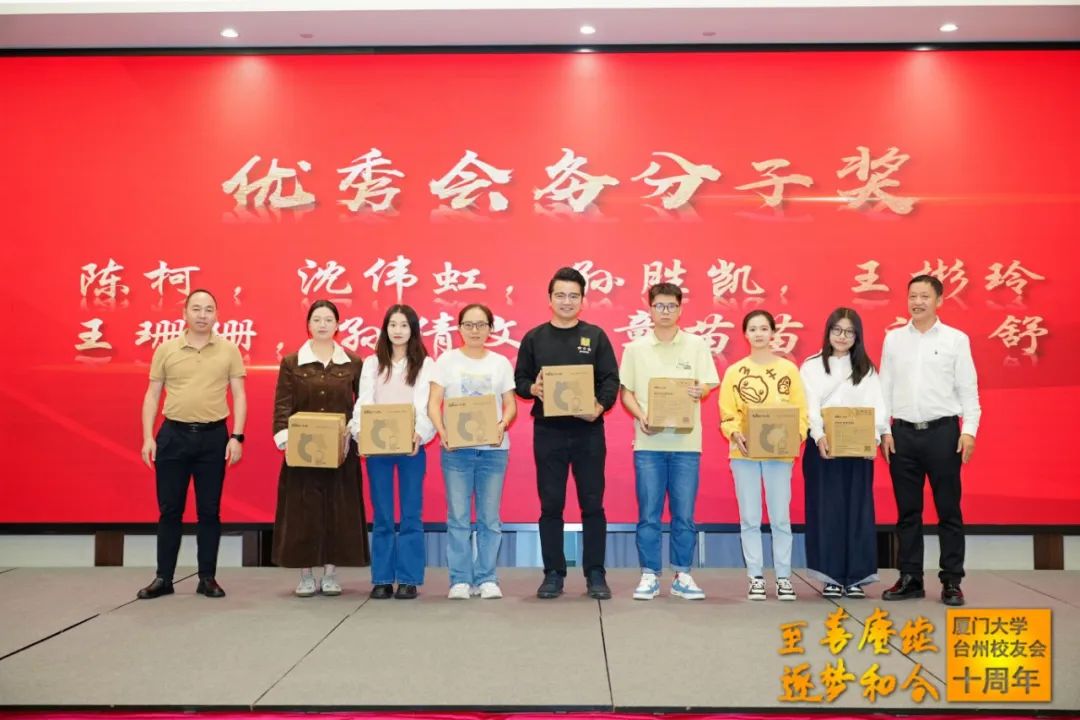 罗华元、台州校友会常务副会长张小华共同为陈柯、沈伟虹、孙胜凯、王彬玲、王珊珊、孙倩文、章苗苗、谢舒等校友颁发优秀会务分子奖。