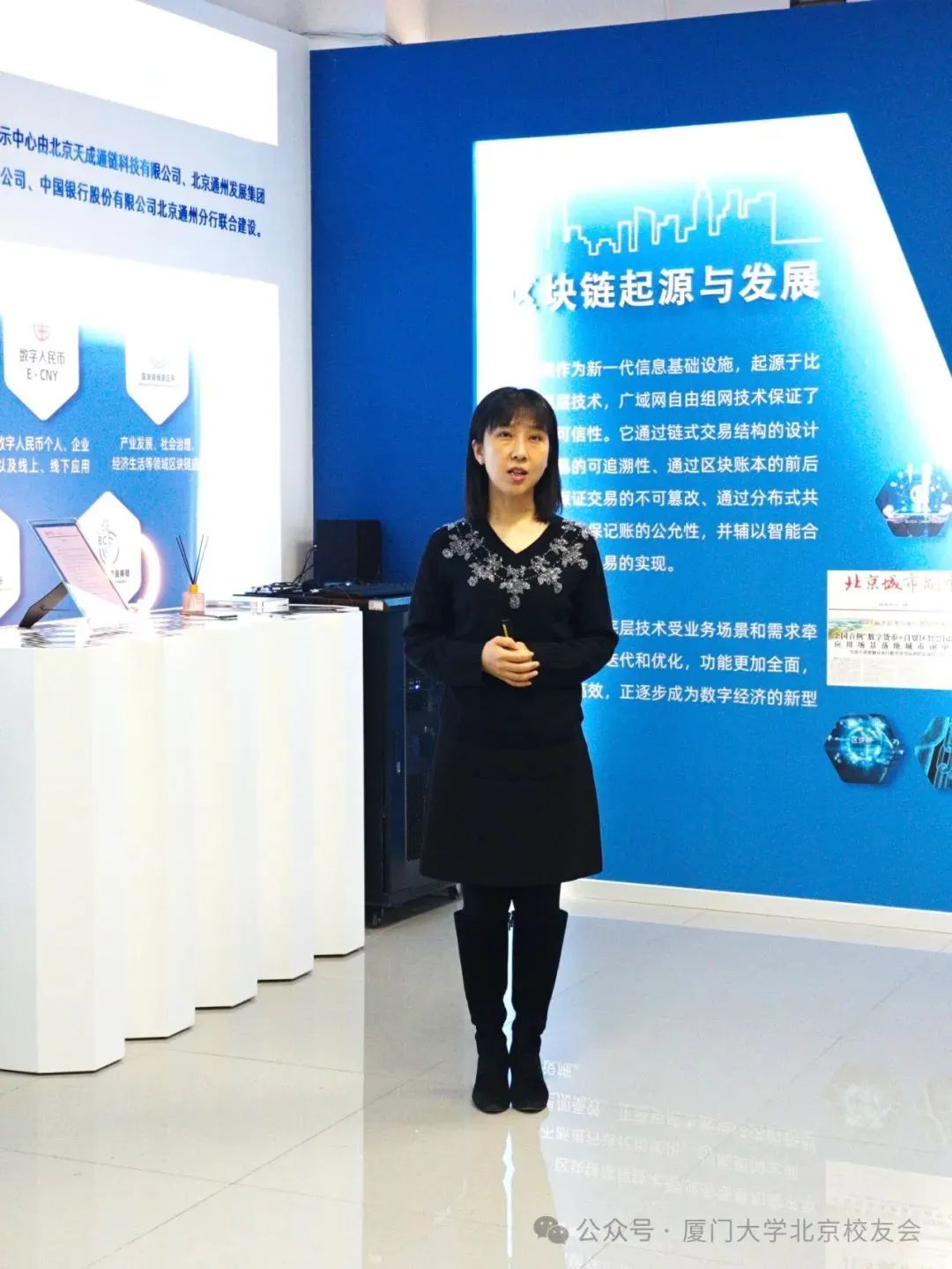 参观环节,吕雯围绕区块链技术的发展与政策指导、数字人民币的产品形态与场景建设、人工智能落地成果的软硬件展示以及数字人和数据要素产品等内容,向在场的校友们详细介绍了北京城市副中心Web3.0科普和应用研发实验基地。校友们通过实地参观,深入了解了该基地在科技创新与应用研发方面的前沿成果。
