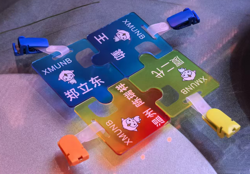 多款拼图铭牌:现场特意准备了校友专属的姓名拼图铭牌,家属以及厦二代们也有自己的专属铭牌。四个拼图可以实现一个完整的正方形,象征着厦大人手拉手,心连心。