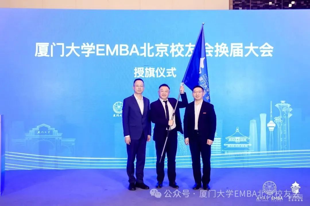 白云涛、张伟杰向第二届厦门大学EMBA北京校友会会长于林义授旗。