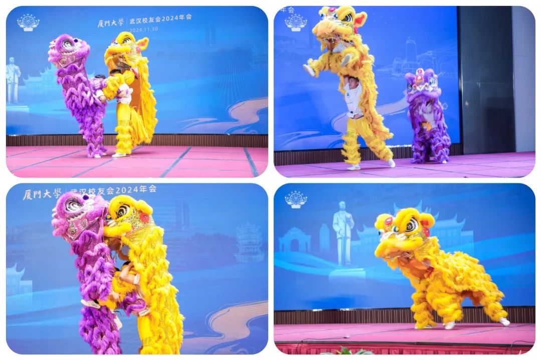 一阵喧天锣鼓声中,两只雄狮跃上舞台。它们或跳跃争斗,或翻滚嬉戏,最后以一个高难度直立动作,拉开年会序幕。