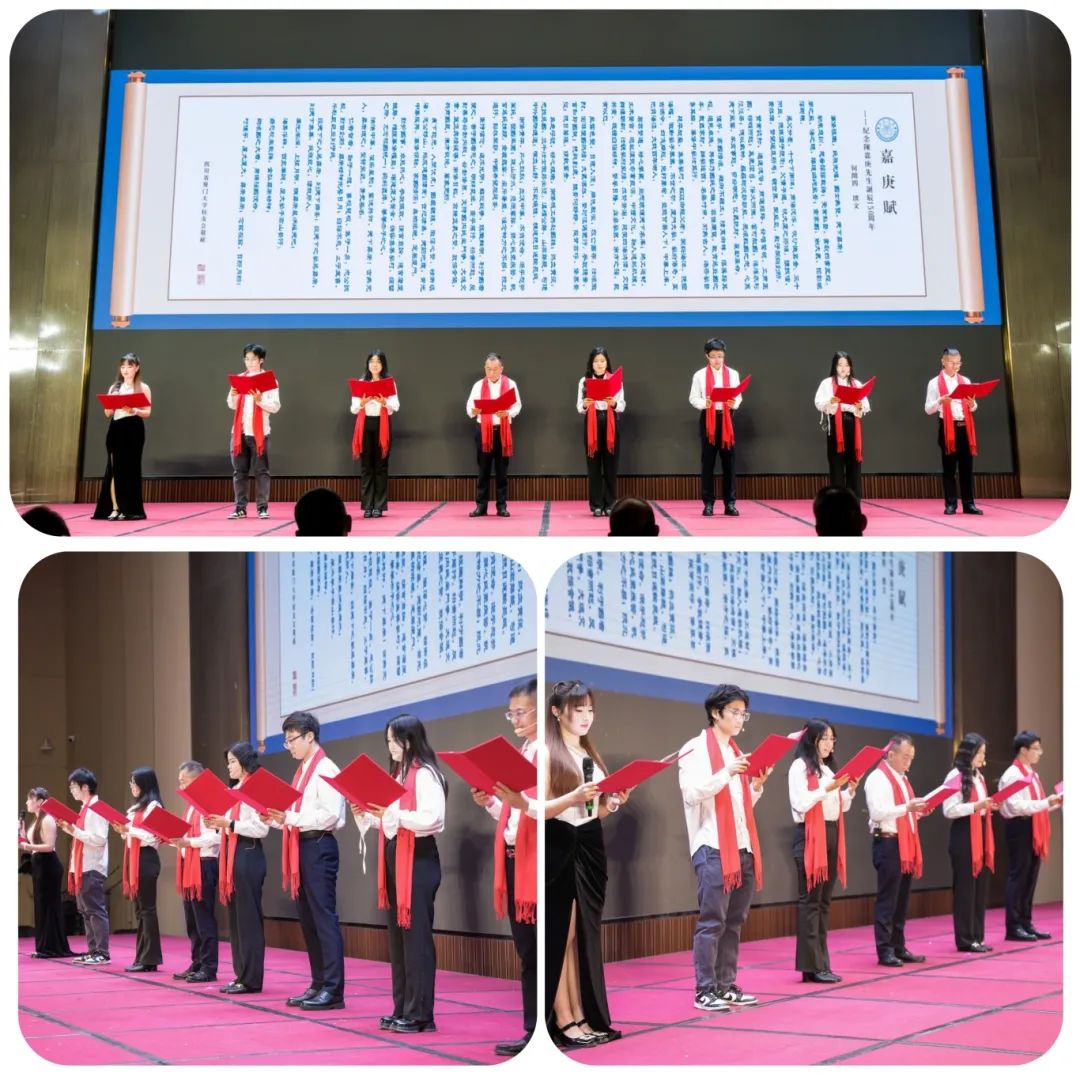 音乐缓缓响起,蜀绣精裱的《嘉庚赋》徐徐展开。八位身着正装、脖围红色围巾的校友,地不分南北、人不分老幼、音不分雅正,深情朗诵这篇在全球各地厦大校友会广为流传的大赋。