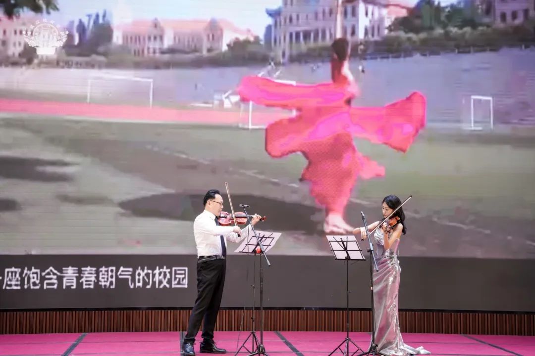 母校音乐系赵纯副教授和弟子2009级音乐系李子頔校友,重温当年师生同台场景,表演著名的肖斯塔科维奇小提琴二重奏。悠扬的旋律,带着身后背景版上美丽的厦大校园漂浮。美好无以复加,曲终空气寂静。
