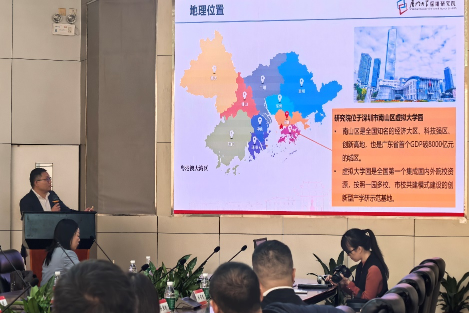 厦门大学深圳研究院科研部黄荣峰介绍深圳研究院的发展现状,以及在政产学研交流合作与科研工作等方面的成果及后续规划。