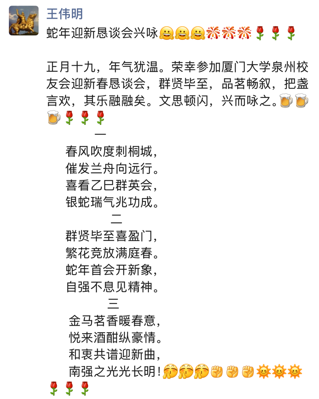 当晚,与会校友共同享受了一场迎春会餐,把盏言欢,其乐融融。王伟明校友现场赋诗一首: