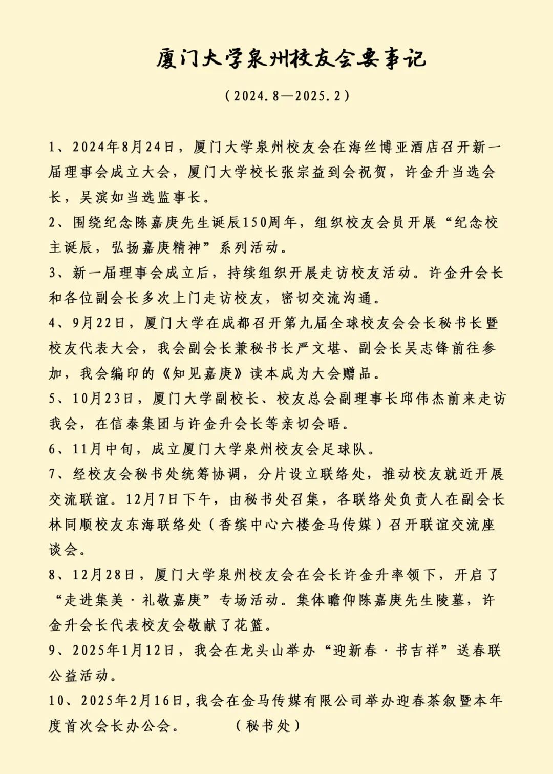 2025年2月16日(正月十九),厦门大学泉州校友会会长办公会暨新春恳谈会在金马传媒有限公司举行。泉州校友会会长许金升主持,副会长兼秘书长严文堪,副会长吴志锋、林同顺等,以及部分骨干校友出席。本会南强咨议王伟明、施能宗、林少川,特邀校友林庆扬、黄文福、张骏康、高飞、卢俊杰等共同参会。