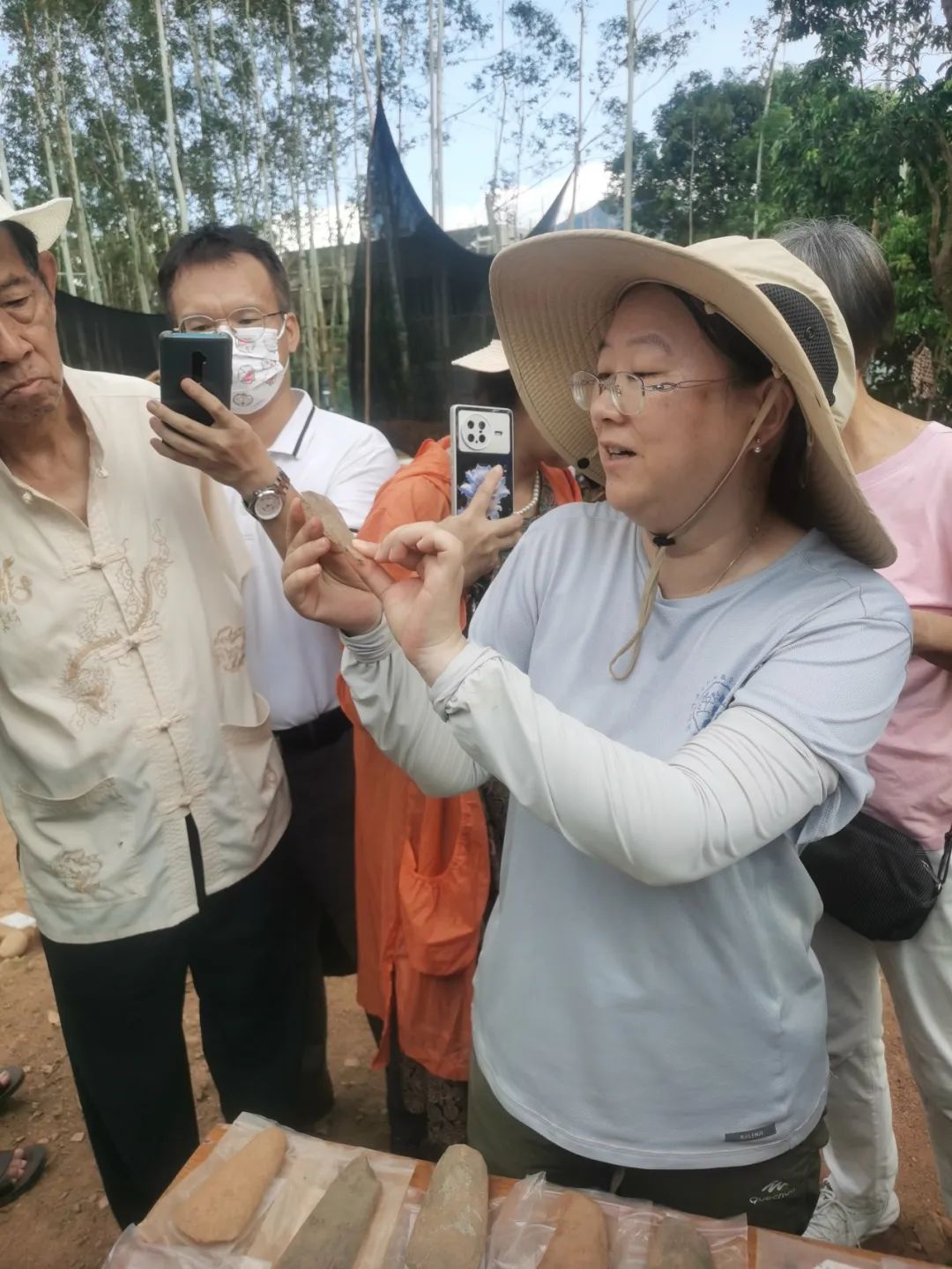 校友和历史爱好者在老师的引导下观摩考古工作者的发掘过程,了解考古工具使用方法,还体验如何区分人工石制品和自然石块,有的在现场采集到石器和陶片,经老师鉴定后交给考古队。大家兴致勃勃,边参观边向老师请教,气氛非常活跃。虽然意犹未尽,但天色渐晚,学习活动在温馨的合影留念中圆满结束,参观团才依依不舍地踏上了返回漳州的行程。
