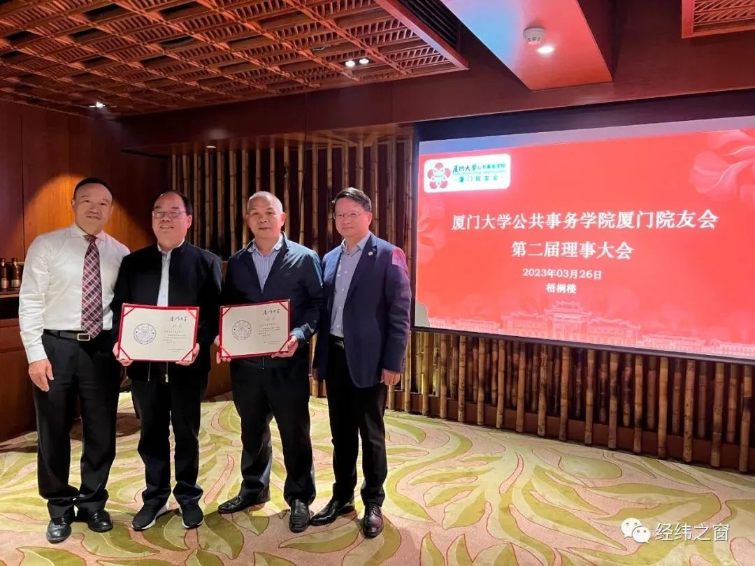 陈万胜名誉会长和陈志铭为院友会顾问朱仁显教授、黄新华教授颁发聘书。