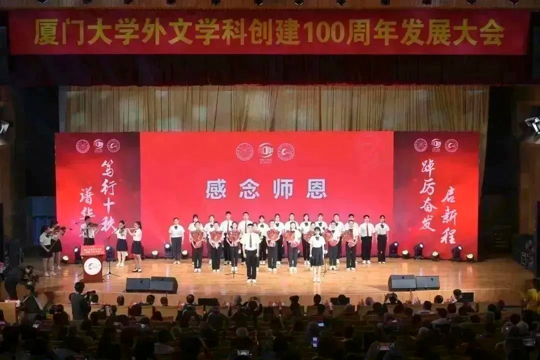 一脉师德,润泽桃李,感念师恩,薪火赓续。一百年来,一代又一代的外文教师不忘从教初心,牢记育人使命,在教学与科研战线上辛勤耕耘,竭诚付出,为厦大外文的发展做出了巨大的贡献。大会特别举行了感念师恩环节,在深情的朗诵和歌声中,学生们搀扶着白发婆娑、耄耋之年的退休教师们走上舞台中央,为他们送上感恩的鲜花和诚挚的祝福。
