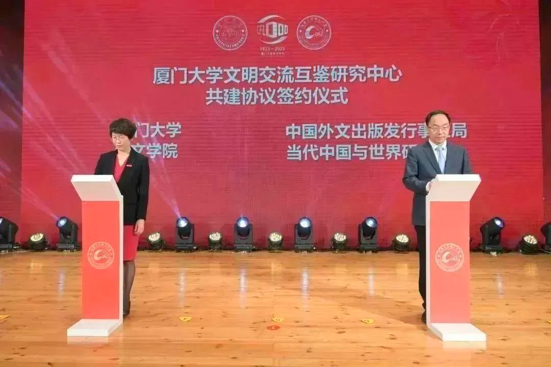为推动不同文化与文明相互尊重、和谐共处,推动中华文明创造性转化和创新性发展,在学校的大力支持下,外文学院成立了“厦门大学文明交流互鉴研究中心”。大会举行了中心揭牌暨共建协议签约仪式。中国外文局当代中国与世界研究院院长于运全、福建省委宣传部副部长陈钦灿、厦门市金砖创新基地建设领导小组办公室常务副主任黄峰、外文学院院长陈菁共同为中心揭牌。