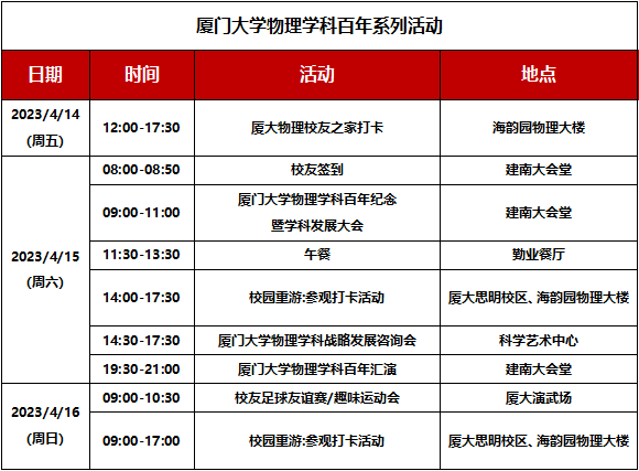 佳期渐迩,同心隆盼。我们诚挚邀请海内外院友、社会各界宾朋莅临现场参与活动,或通过厦门大学物理学科创建100周年专题网站了解盛况,共襄盛举。学院也热忱欢迎校友、宾朋选择全年其他时段返校,我们将持续开展形式多样的系列活动并全力做好接待服务工作。