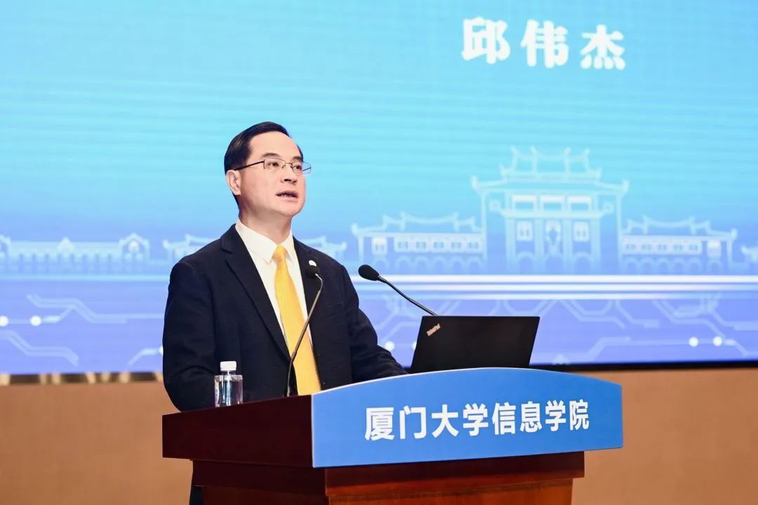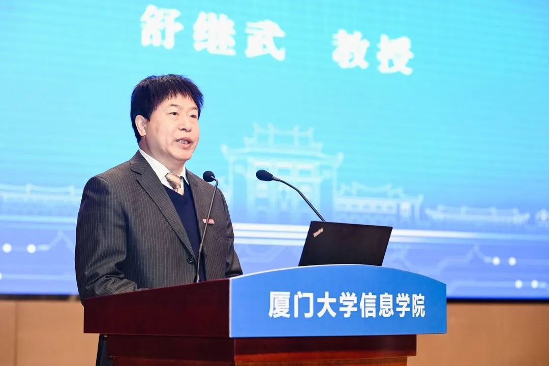 信息学院院长舒继武首先致辞。他回顾了厦门大学信息学院的发展历史,特别是2019年,学校优化重组信息科学与技术学院与软件学院成立信息学院以来,学院取得的主要发展成就。