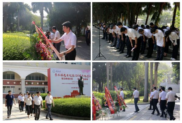 随后,举行献花仪式。厦门大学副校长江云宝、物理科学与技术院长陈张海、萨本栋微米纳米科学技术研究院副院长王敏、物理科学与技术学院副院长吴顺情、物理科学与技术学院副书记郑诚明上前整理花篮缎带。全体师生面向萨本栋铜像深沉鞠躬,并环绕塑像一周进行瞻仰与缅怀。