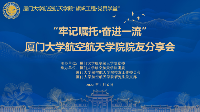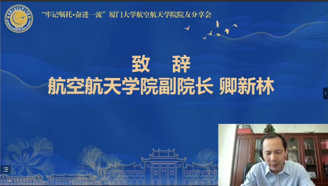 值此厦门大学101周年华诞、厦门大学航空航天学院建院7周年之际,4月8日上午,航空航天学院“旗帜工程·党员学堂”——“牢记嘱托,奋进一流”航空航天学院院友分享会通过线上开展。院友中国电研威凯检测技术有限公司总经理邓俊泳、航天五院502所研究员陈长青、北京控制工程研究所高级工程师范炜、大连理工大学教授郭江、厦门太古飞机工程有限公司副董事长李正林、航空工业(集团)有限公司134厂副总经理潘昆、华润集团智能与数字化部专业总监韩东辉、厦门航空机长张力诚、北京凌空天行科技有限责任公司控制系统主任设计师程晓倩、机械工业仪器仪表综合技术经济研究所高级工程师杜晓辉、中国电子科技集团公司第四十一研究所项目经理刘龙参加了本次分享会。航空航天学院副院长卿新林、党委副书记林蔚、机电工程系主任祝青园、自动化系主任洪文兴、仪器与电气系副主任郑高峰、飞行器系副主任王晓光、动力工程系副主任许伟伟、全体辅导员以及学生党员代表出席了分享会。活动由机械创新研究生党支部张凯瑞主持。