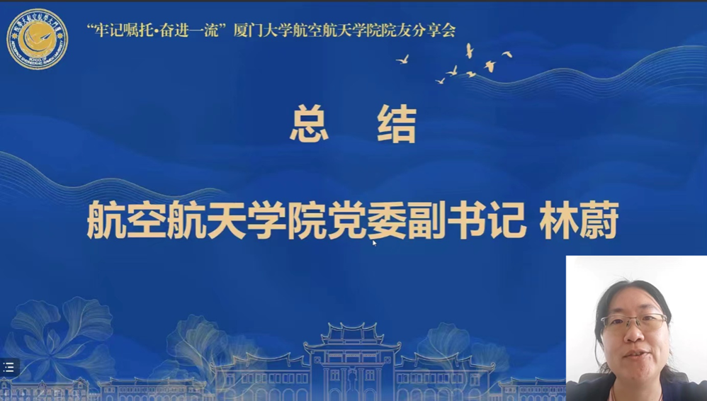 学院党委副书记林蔚就本次院友分享会作总结,她提到今天的云端交流,将母校情、母院情、师生情、同窗情在这里凝结、升华,这一份份殷殷尊师情,一颗颗拳拳爱院心,是我们航空航天学院的光荣,学院因院友们的支持和情谊而倍感骄傲和自豪。她表示院友永远是母校最宝贵的财富,是母院事业发展最可信赖的力量,我们将继续推进航空航天学院院友会,一方面进一步整合院友资源,塑造学院品牌;另一方面能更好地服务院友、回馈院友。学院将和院友们一起努力,推动院友工作百尺竿头、更进一步,把院友会建成凝聚院友、共创未来的坚强纽带。