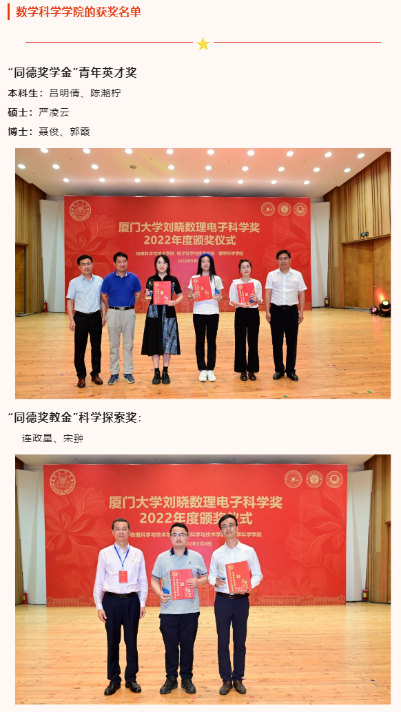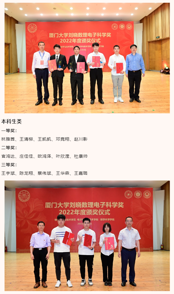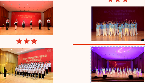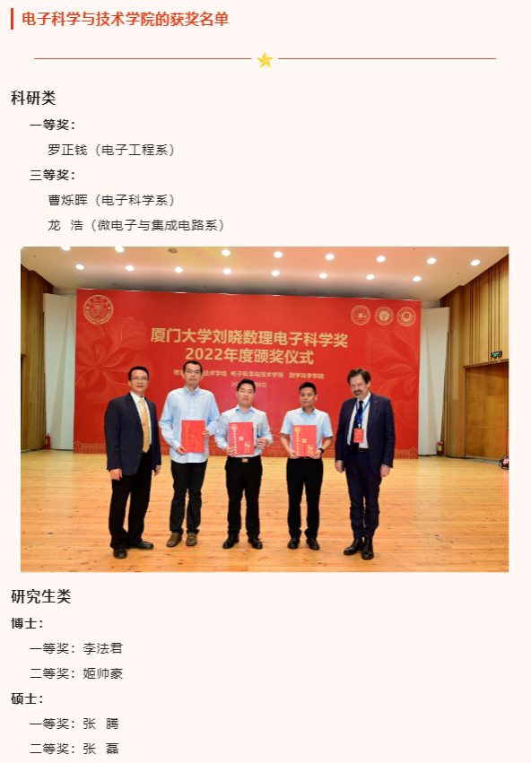 此外,出席本次颁奖典礼的还有物理科学与技术学院党委书记李书平,党委副书记郑诚明,副院长陈理想,副院长陈张海,副院长黄凯等老师;电子科学与技术学院院长陈忠,党委副书记方银水,副院长董俊等老师;数学科学学院党委书记黄宝秋,厦门大学南强杰出贡献奖获得者、数学科学学院钟同德,党委副书记毛通双,副院长张剑文,副院长金贤安,副院长宋翀等老师。以及三个学院获奖师生和学生代表参加了颁奖典礼。颁奖典礼由物理科学与技术学院党委副书记郑诚明主持。