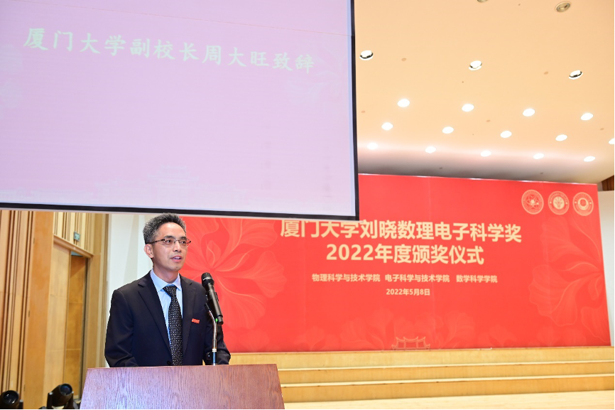 最后,厦门大学副校长周大旺致辞。在讲话中向Lars Samuelson教授、刘晓校友和各位嘉宾的莅临表示热烈的欢迎,向长期以来关心母校事业发展的刘晓校友表示衷心的感谢,向获得“刘晓数理电子科学奖”的师生表示衷心的祝贺。周大旺表示,学科建设水平体现了一所高校的整体办学实力、核心竞争力和发展潜力,我们要进一步总结提升,深化学科内涵、打造专业特色,全面提高人才培养质量,践行立德树人初心和为党育人、为国育才使命,为全面建设社会主义现代化国家、实现中华民族伟大复兴的中国梦作出厦门大学新的更大贡献。