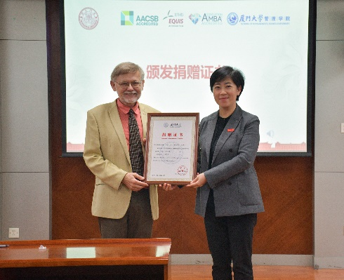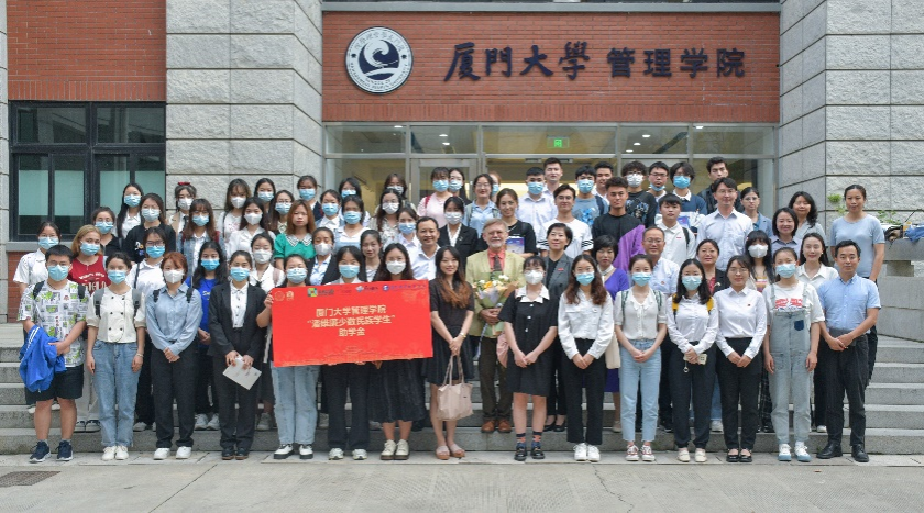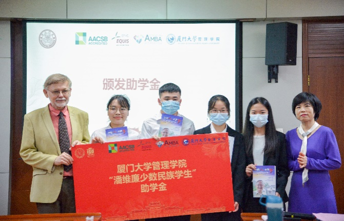 为鼓励管理学院少数民族困难学生勤奋学习、奋发上进,自2021年4月起,潘维廉教授已累计向厦门大学捐赠48万元设立助学基金,用于连续每年资助管理学院家庭经济困难的少数民族学生。活动中,赵晓慧首先为潘维廉颁发捐赠证书。随后,郑碧娇宣读助学金颁发决定,今年共有59名本科生、13名研究生获得该助学金资助。紧接着,潘维廉、郑碧娇共同为获助学生颁发助学金并赠送书籍《中国人中国梦——中国人的生活变迁与脱贫攻坚》,潘维廉、李峰共同为“石榴籽”少数民族学生骨干培训班学生赠送书籍。