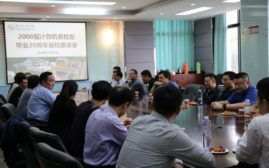 11月28日,信息学院2000届计算机系校友毕业20周年返校座谈会在海韵园行政楼A306举行。信息学院党委书记刘弢、副书记郑镇锋、计算机科学系教工党支部书记曲延云、辅导员蔡婧蓉与各地归来的20余位2000届计算机系校友欢聚学院,共叙母校情、师生情和同窗情。