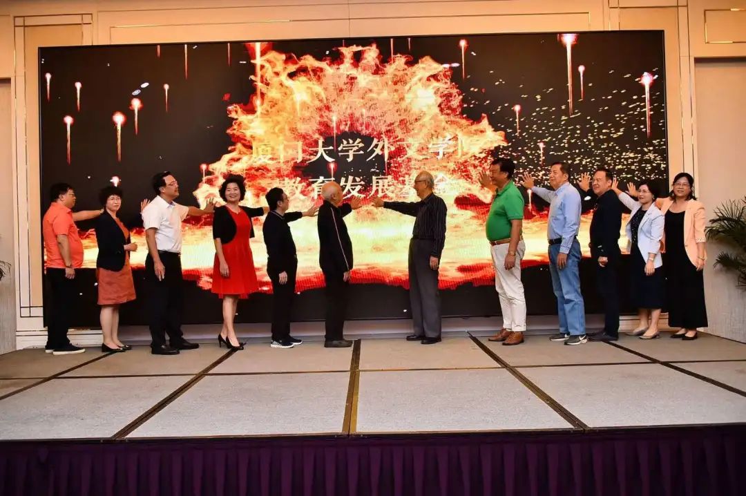 随后,最激动人心的时刻到来了。新老四代外文人与受邀佳宾共同登台,在一片璀璨绚丽的火花中,在全场院友的共同见证下,“厦门大学外文学院教育发展基金”正式启动。