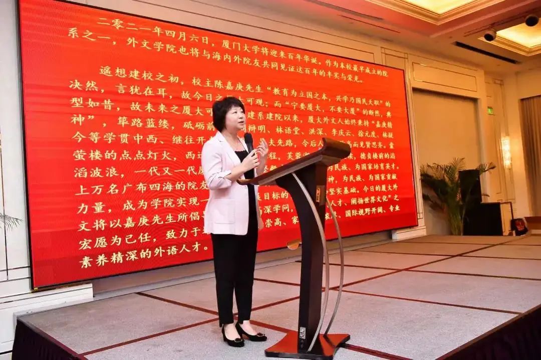 徐琪副院长代表学院向院友们简要报告“厦门大学外文学院教育发展基金”设立的背景与意义。她指出,校主嘉庚先生倾资兴学、报效祖国的爱国精神激励着一代又一代厦大人,厦大独特的文化传统和人文关怀造就了厦大人特有的“感恩、开放、创新、和谐”的文化特质。长期以来,外文学子秉承校训,在不同的领域、以共同的精神,关心、支持母院各方面的发展,成为母院建设不可或缺的重要力量。在母校百岁生日即将到来之际,学院启动“厦门大学外文学院教育发展基金”,聚沙成塔,以助力学院的学科建设、人才培养等各项事业,在奋进“双一流”建设的新征程中,努力开创一流业绩、作出一流贡献。