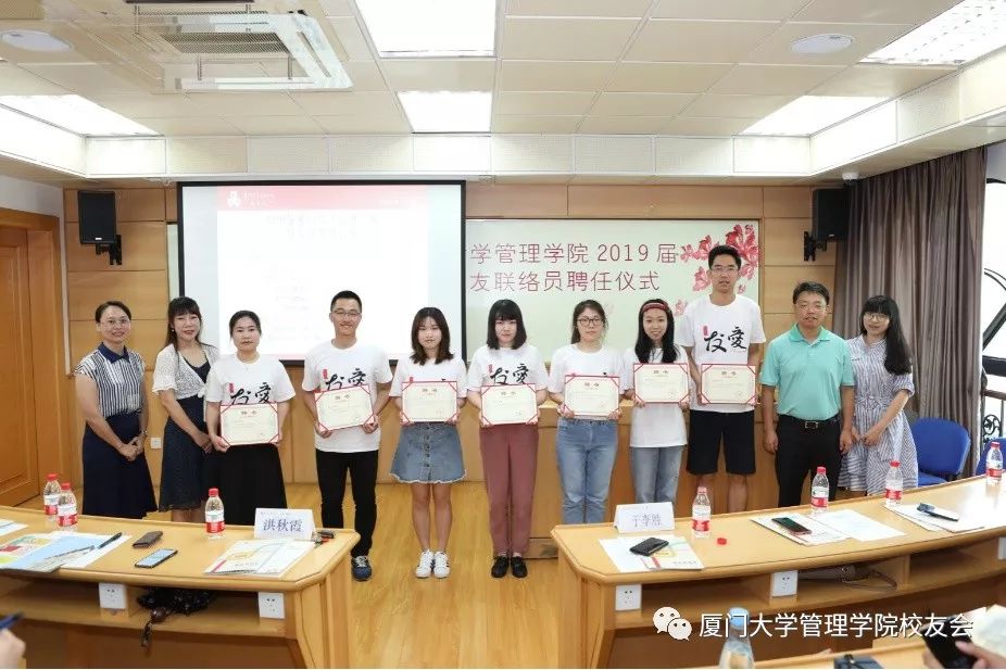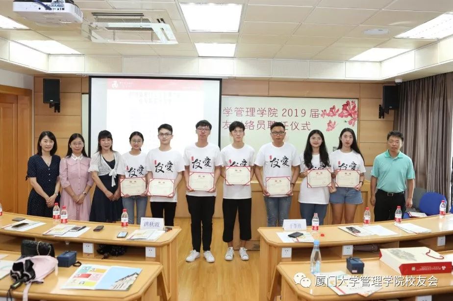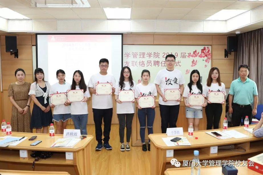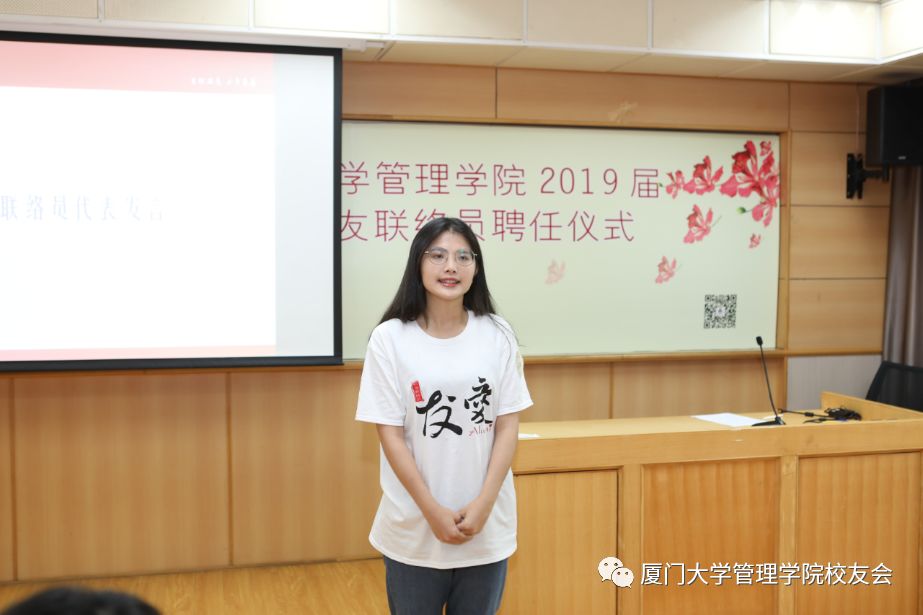 随后进行了联络员的聘书颁发仪式,同学们身着定制T恤,接过老师递来的聘书,从此成为管院联络员大家庭的一员。2019届联络员代表苏菲菲同学为此表达了自己的感受,从代表学院参访联络员到成为联络员角色的转变让自己很感激,管理学院心系每个走出去的学子,为他们送去温暖,而情感是双向的,作为联络员的他们也会牢记自己的使命。