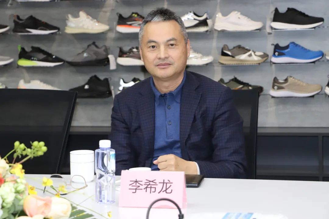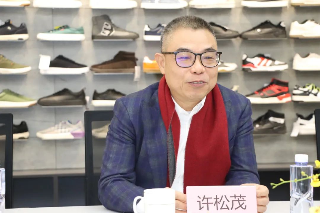 1979级校友、艾德(福建)投资有限公司董事长许松茂带领大家参观不同类型的鞋类样品展示、设计、材料等区域。