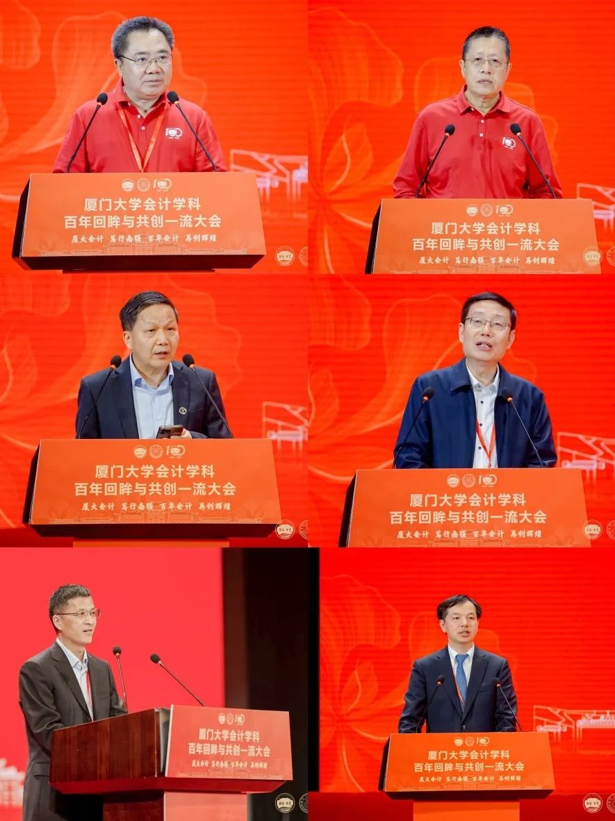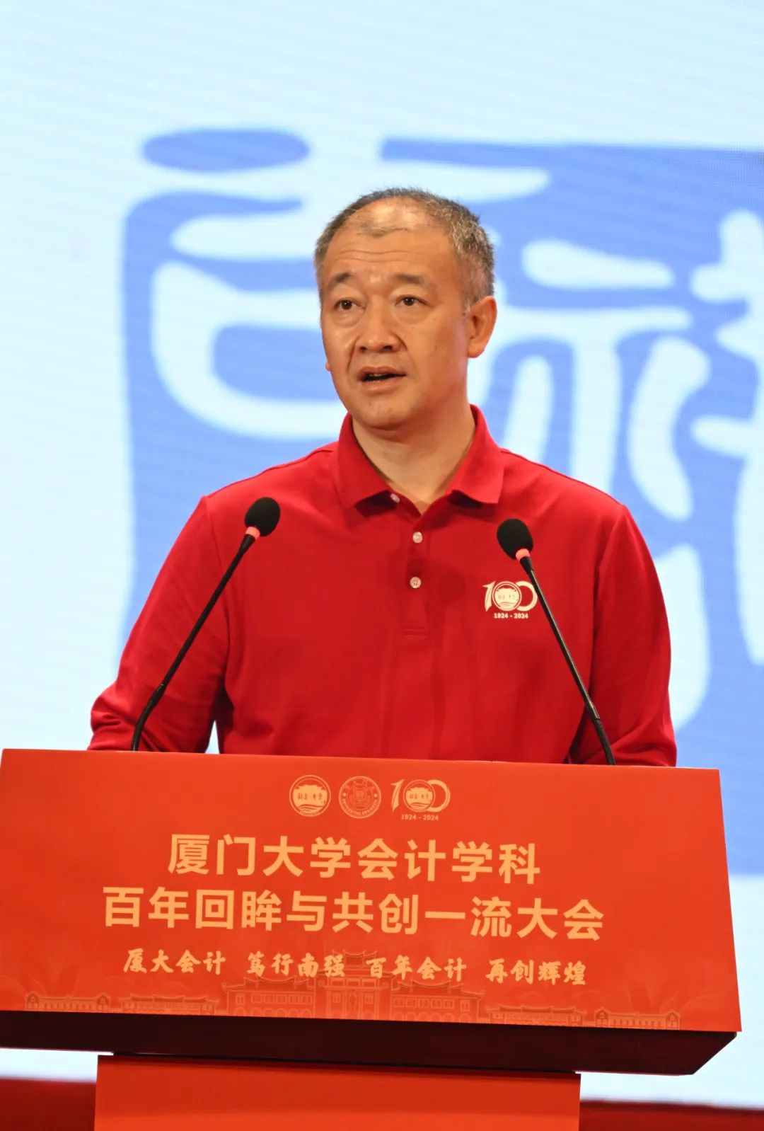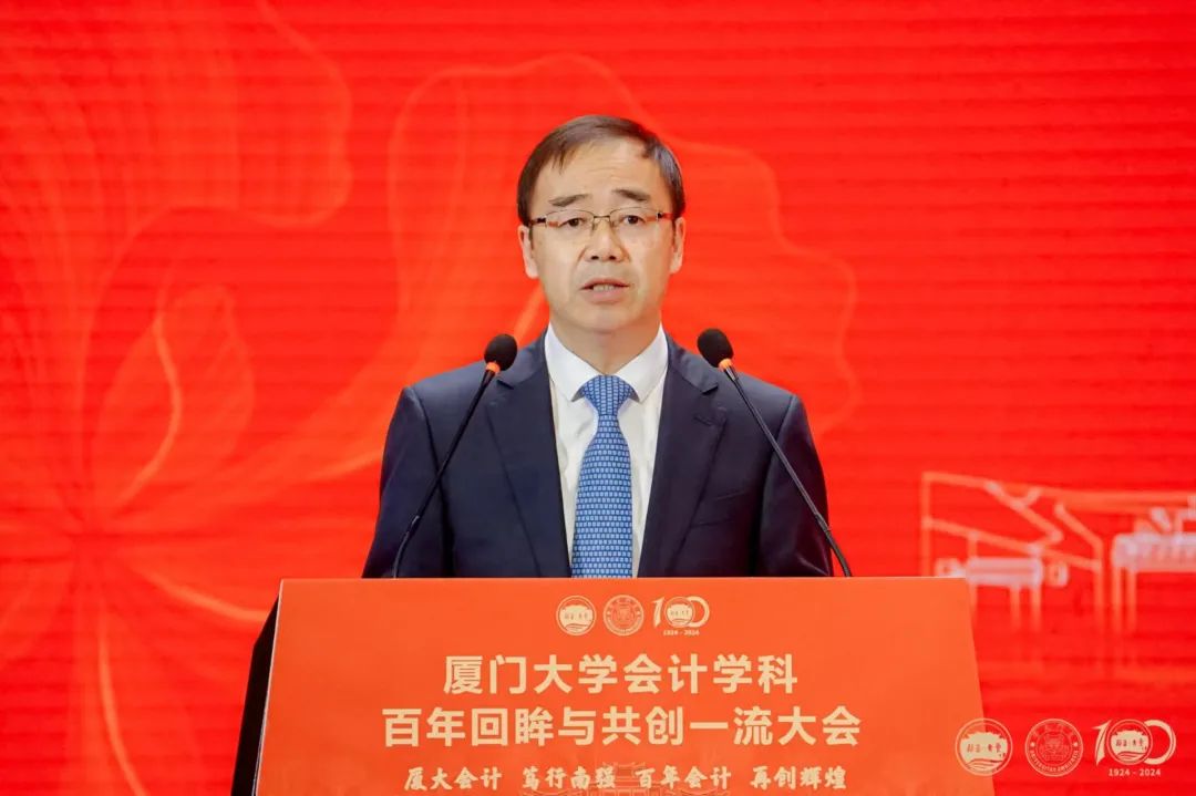 厦门大学校长张宗益代表学校向会计学科创建100周年表示热烈祝贺。他表示,会计学科作为厦门大学的重要优势学科和支柱学科之一,始终秉持“自强不息,止于至善”的校训精神。百年来,会计学科名师辈出、学脉悠长,作育英才、桃李天下,勇攀高峰、硕果累累。他指出,以数字化技术为主导的新一轮科技革命和产业变革迅猛发展,引发社会经济环境和产业发展格局发生深刻变化,为会计理论和实务研究创造了更大的舞台和空间,也提出了更高的要求和挑战。张宗益对厦门大学会计学科的未来发展提出以下展望:立足新的历史起点,厦大会计应以习近平总书记致厦门大学建校100周年重要贺信精神领航,传承优良传统,回应时代期望,站稳中国立场,勇争世界一流,彰显厦大特色。一是要创新育人模式,着力培养引领未来的会计专业人才,积极构建产学研用多要素融合、多主体协同的育人机制。二是要强化内涵建设,服务建构中国自主的会计知识体系,构建具有主体性、原创性,彰显中国特色和优势的会计学科体系、学术体系和话语体系。三是要提升服务能级,积极贡献经世致用的一流创新成果,要进一步发挥咨政建言、服务科学决策的智库功能。