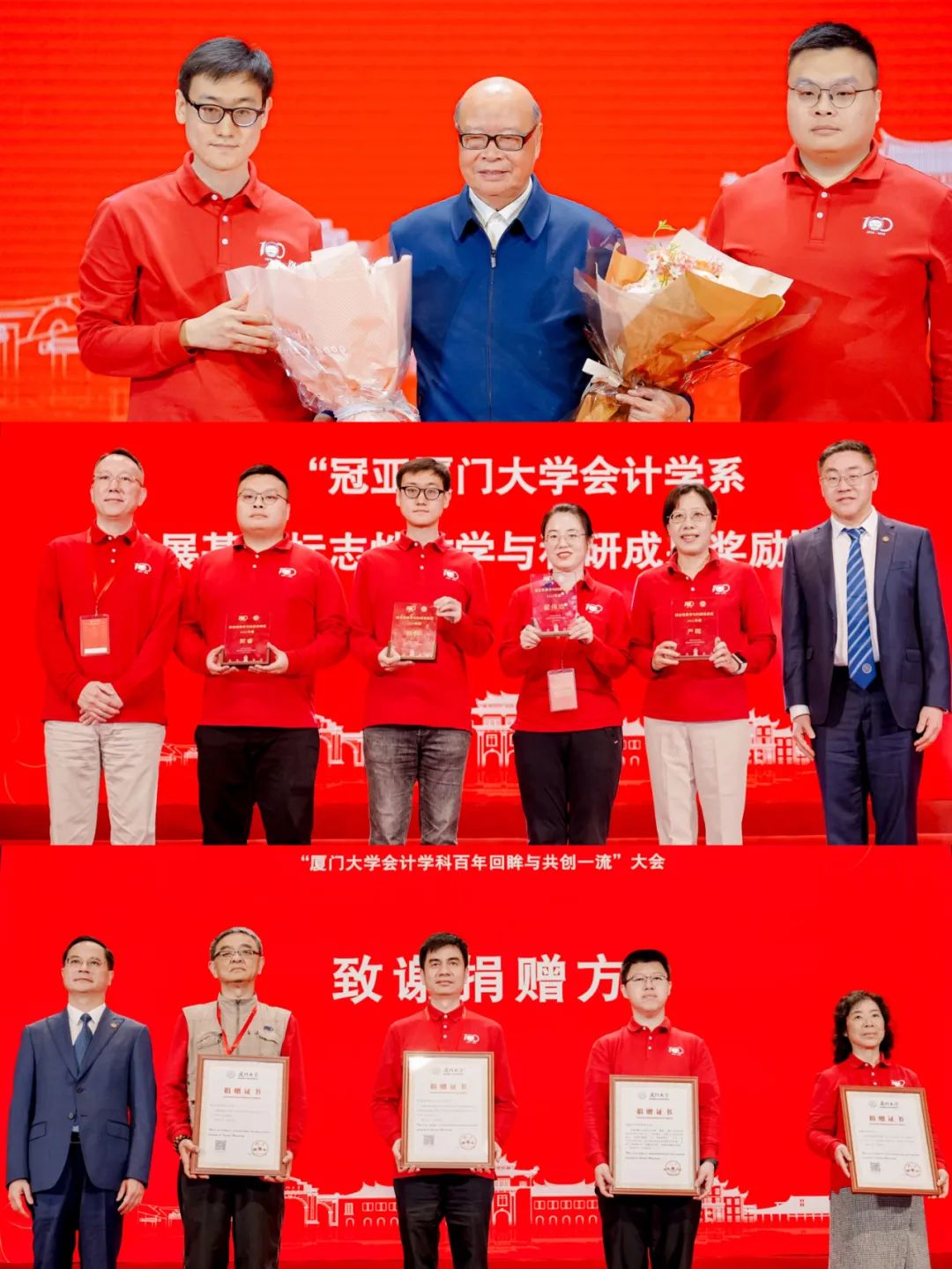 值此庆典,大会特别举行了致谢师恩环节。陈守文老师代表六位从教五十周年以上的教师上台接受青年教师代表的献花和全场师生的祝福,大会感谢各位退休教师长期以来对厦大会计学系做出的贡献。接着,厦门大学副校长方颖和系友代表朱益民为严晖、郭睿、熊枫、翟伟欢四位教师代表颁发了“冠亚厦门大学会计学系发展基金标志性教学与科研成果奖励”奖项,大会对冠亚基金捐赠方徐华东、崔立澜、朱益民三位系友表示了衷心的感谢。最后,厦门大学副校长邱伟杰向容诚会计师事务所厦门分所,徐筱玲女士,蔡雪琳女士和吴少云先生伉俪,厦门大学校友会广州、上海、北京、福州和南京会计分会等本次百年系庆的捐赠方颁发捐赠证书。