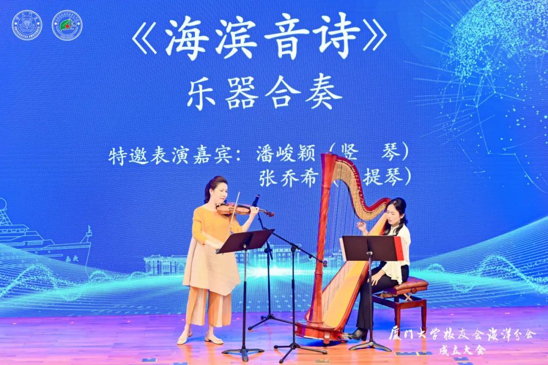 在大会正式开始前,特邀嘉宾艺术学院潘峻颖、张乔希老师带来的小提琴、竖琴合奏《海滨音诗》,心潮澎湃的暖场视频,以及全球校友和在校师生的云端祝福,勾起了院友们满满的回忆。