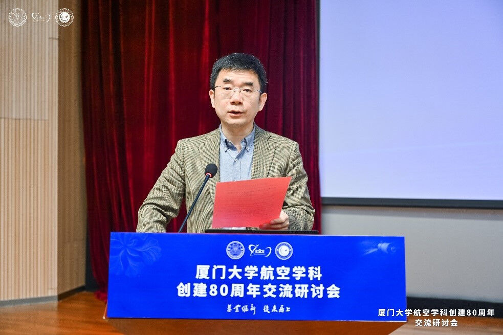厦门大学航空航天学院副院长黄玥带领现场全体人员共同回顾了厦门大学航空学科初创、调整、复办和新世纪建设的八十载峥嵘岁月。他代表学院向广大航空界专家、兄弟单位、学校各级领导、各界校友对学院的支持与帮助致谢。1944年,厦门大学于纷飞战火中成立航空工程学系,成为中国高等教育发展史上最早创办航空教育的高校之一。1951年,根据全国院系大调整的部署,厦门大学航空工程学系并入清华大学,后又随清华大学航空学院参与组建北京航空学院(今北京航空航天大学)。在此期间,厦门大学航空学科筚路蓝缕,辛勤耕耘,培养了以中国工程院院士张启先、陈一坚等为代表的扛鼎之才及一大批高水平专业学者和专业人才。1994年,厦门大学复办航空教育。三十年来,厦大航空人赓续前行、奋楫争先,秉承“自强不息,止于至善”的校训精神,恪守“旧业维新,后来居上”的院训精神,厦门大学航空学科重新成为我国航空航天人才培养和科学研究的重要基地。他表示,迈入新的发展阶段,学院将深耕新质生产力的空天价值,勤学深研、砥砺前行,书写航空航天教育厦大方案,在推进中国式现代化的伟大进程中为实现航天梦、中国梦贡献航院力量。
