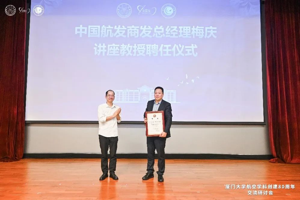 同时,大会还进行了梅庆总经理的厦门大学讲座教授聘任仪式,尤延铖为梅庆颁发聘书。