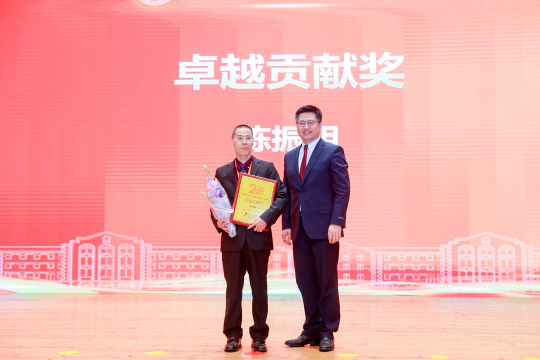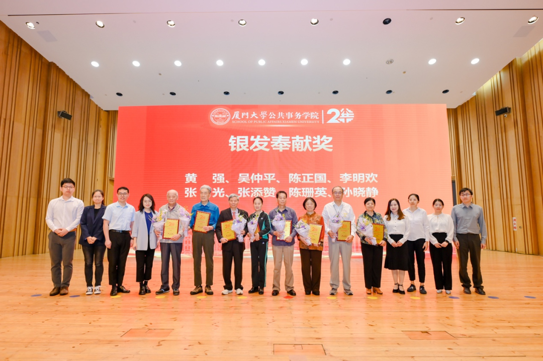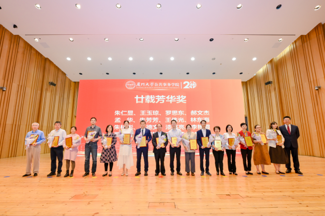 韶光流转,盛世如约,含英毓秀,桃李二十载。二十年来,公共事务学院的诸位老师辛勤耕耘、竭诚付出,矻矻终日育桃李,孜孜昼夜创硕果,为感念师恩、表彰先进,大会现场为陈振明教授颁发卓越贡献奖,为吴仲平、黄强等教师颁发银发奉献奖,为朱仁显、罗思东等教师颁发廿载芳华奖。于文轩、学院青年教师代表共同为各位老师颁发奖牌,学生代表为老师们献上感恩鲜花,送上最诚挚祝福。