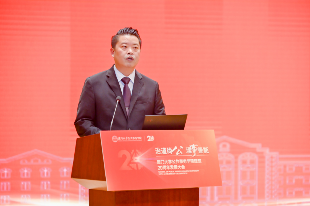 厦门市人民政府党组成员、副市长廖华生在致辞中向学院表示热烈祝贺与衷心感谢。他指出,厦门大学公共事务学院始终与厦门市双向奔赴、互促共赢,是校地高质量融合发展的典范。学院培育了大批高素质公共管理人才,将独特的专业优势与厦门的发展实践相结合,为厦门市经济社会进步提供有力支持。作为从学院走出去的公事学子,他秉持学院精神、承担公共之责,积极践行公共管理的先进理念。他希望在陈嘉庚先生诞辰150周年之际,学院更加积极服务国家战略、持续支持地方发展,为强国建设、民族复兴做出新的更大贡献。