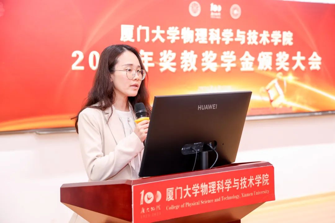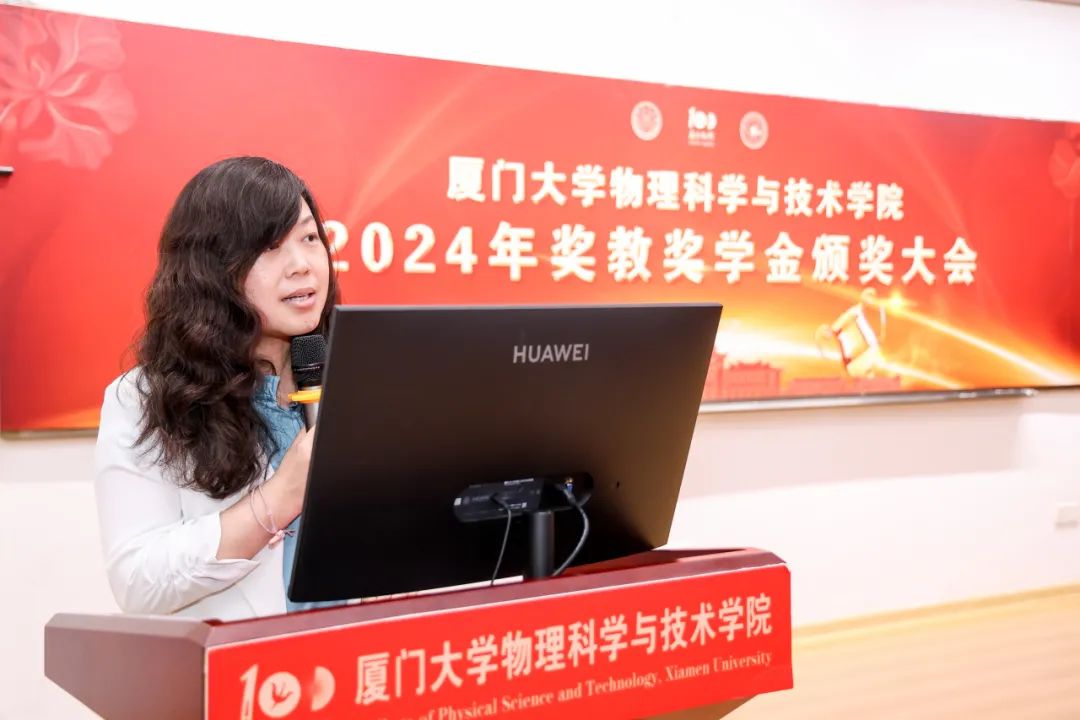 获奖教师代表吴雅苹教授分别从科研工作者、教育工作者两个身份的责任与担当发表感言:科研工作是挑战也是使命,不仅探索物理世界的奥秘,也为国家的科技发展贡献力量;教育工作肩负着培养未来科技人才的重任,应以身作则,培养学生的创新思维和实践能力。