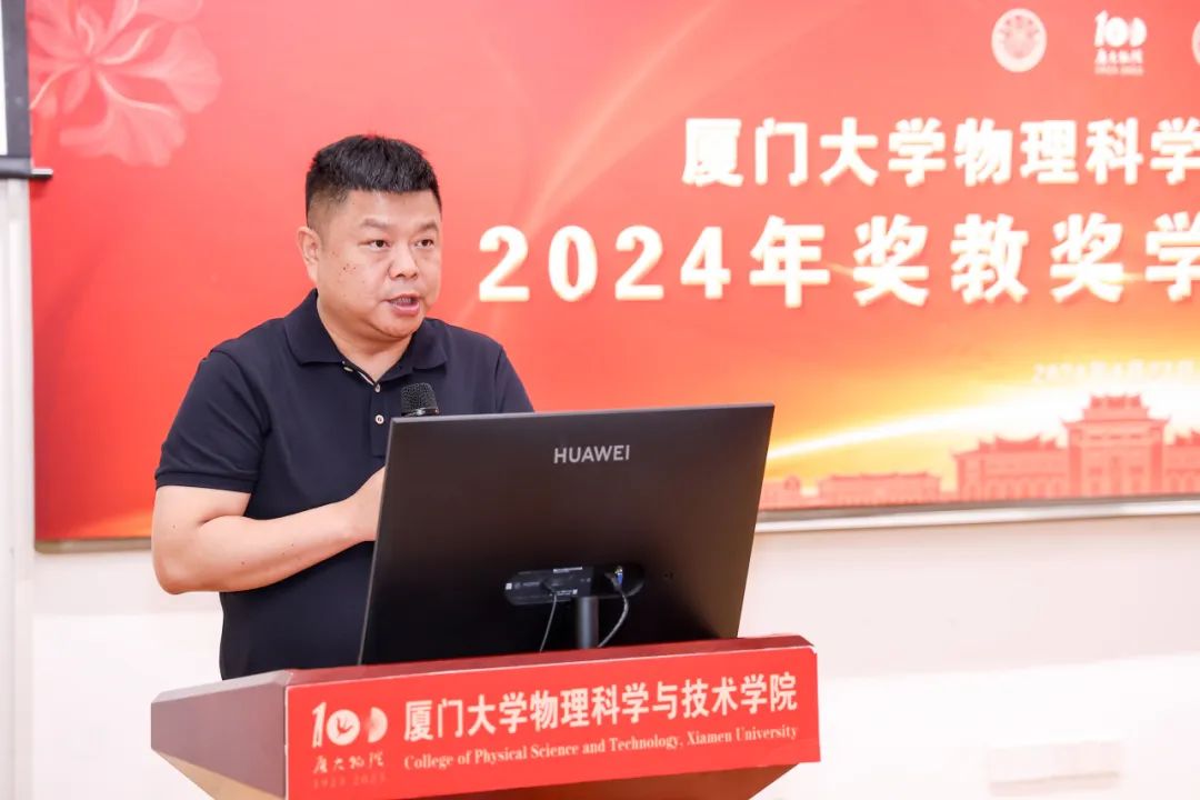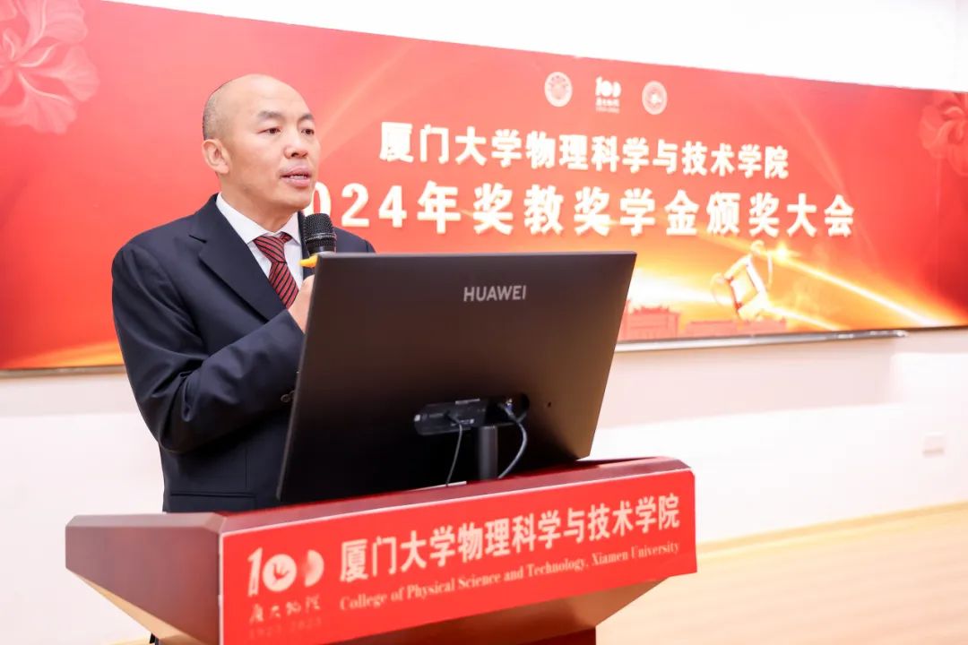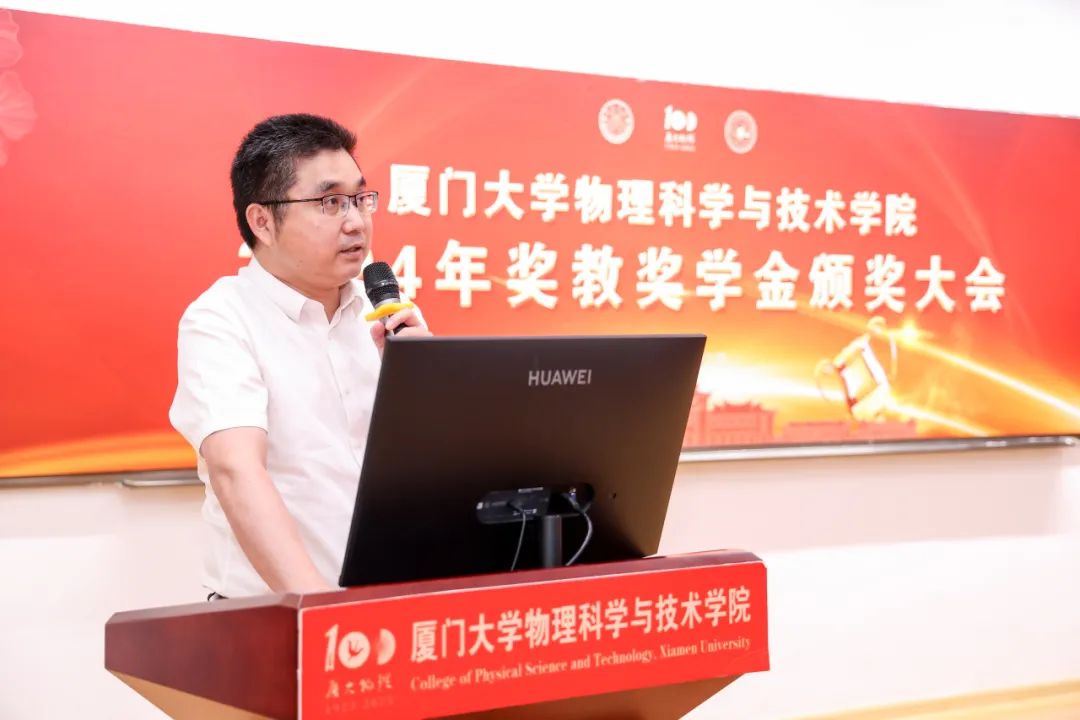 李书平代表学院向校友及社会各界人士的慷慨捐赠表示感谢,并表示所设立的奖教奖学金激励一批又一批师生勇攀科学高峰,取得累累硕果。他回忆百年以来厦大物理人克服一切困难、孕育卓越学科的历程,介绍近年来厦大物理学科取得的各项成绩,并展望学科发展的新方向。最后,他对获奖师生表示衷心祝贺,并呼吁全院师生继续发扬“自强不息,止于至善”的精神,在科研学习、科创竞赛、社会服务等领域全面发展,再创佳绩。