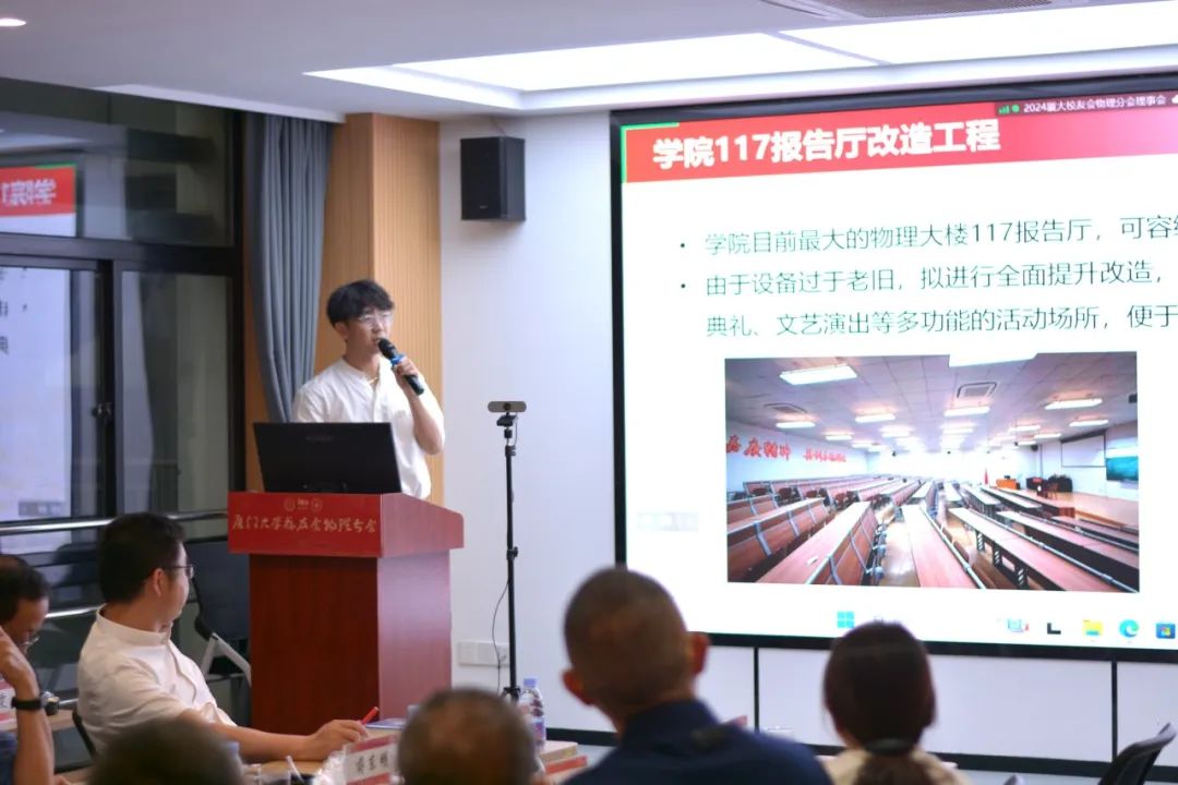 议题讨论环节,陈张海讲述物理分会后续活动开展计划,学院工程师戴朝晖为校友介绍学院117报告厅改造工程方案。