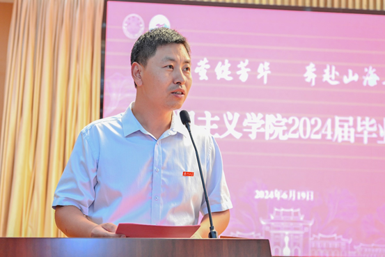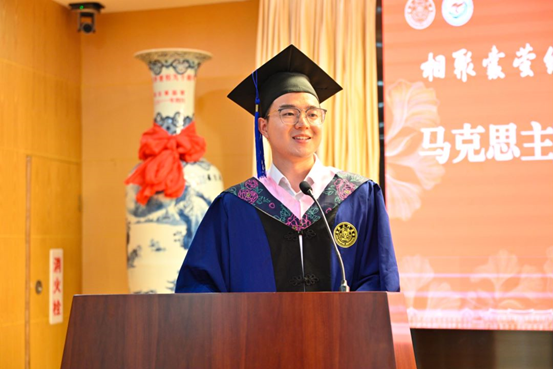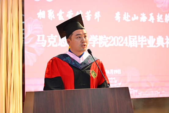 离别在即,少不了谆谆嘱托。教师代表、2021级硕士生班主任池骋发言。他回顾了同学们在厦大求学的难忘时光,并深情寄语各位毕业生:希望同学们不断追求卓越,在今后的路程中,继续书写厦大人自强不息、止于至善的篇章;希望同学们牢记身上的责任,抓住时代机遇,发挥自身特长,积极建功立业;希望同学们做好人生旅途上的选择,把个人兴趣与社会需要进行有机结合,做自己最喜欢的事情,到祖国最需要的地方。他鼓励大家,要大胆而自信地投入火热的新生活,用满腔的热忱去实现自己的美好理想,厦大和厦大马院永远是大家忠实的、可信赖的朋友。