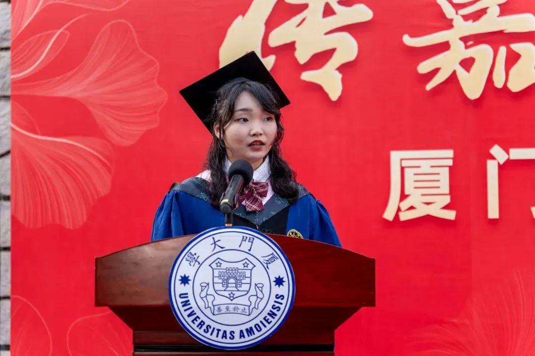 卞开祥为学弟学妹们送上真挚的寄语。他回顾自己离开校园后的奋斗历程,感念于母校给予的人文熏陶和在外文学习时所获得的专业知识和人生智慧,使自己能够在往后的人生道路上,始终牢记“厦大人”的使命与担当,铭记责任,勇敢前行,并在事业蓬勃发展之时常怀感恩之情,回馈母校,传承嘉庚精神。他嘱咐毕业生们保持谦卑的姿态,涵养开阔的眼界,肩负起时代赋予的责任,为社会的繁荣和进步贡献外文学子之力量。