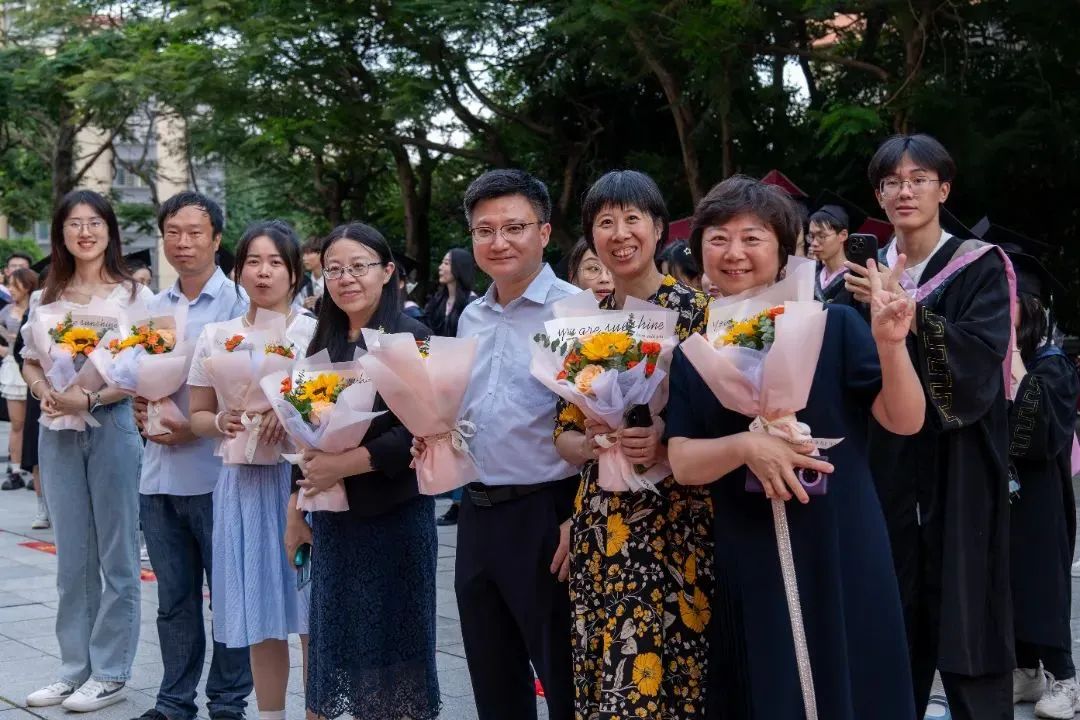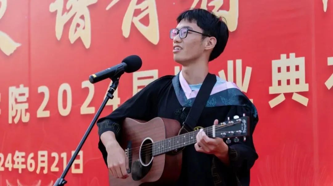 教师与毕业生代表伴随着音乐的鼓点走上舞台,深情演唱了《再见》《See You Again》和《凤凰花季》。台下的师生们也跟随节奏,一同挥动起手中的花束,大声合唱。在歌声中,毕业生们拥抱、合影、交谈、跟唱,用各自的方式与朝夕为伴的老师、同学们道别,也告别了自己独一无二的大学时光。