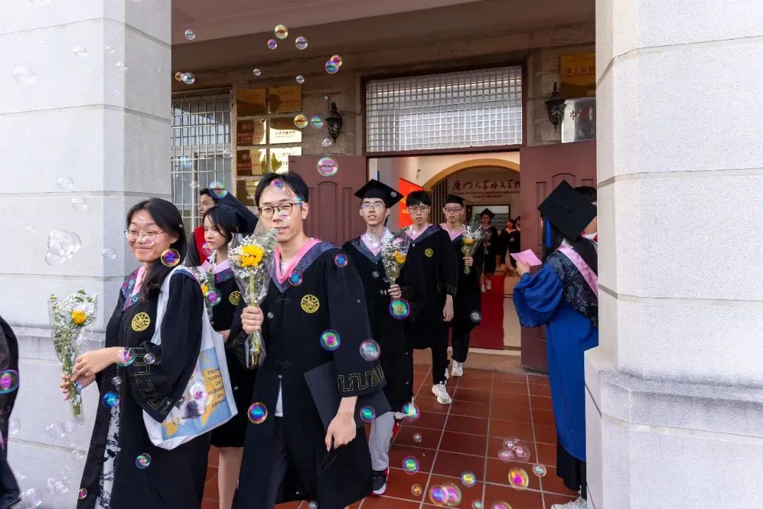 典礼正式开始前,全体毕业生手捧花束,沿着学院大楼阶梯缓缓而下,款款走进会场。在漫天飞舞的五彩气泡中,青春的面孔洋溢着对未来的欣喜与期待,一如手中盛开的向日葵,向阳而生,雀跃鲜活。