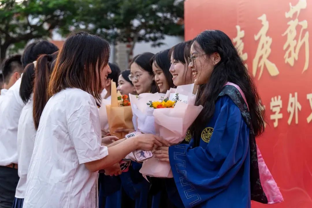 在感恩环节,学弟学妹们向即将毕业的学长学姐献花,感谢她(他)们在学习工作和成长发展上给予的帮助和鼓励。毕业生们接过花束,又将这份感恩传递给在场的老师们,感谢他们多年来的谆谆教诲与悉心栽培。知恩于心,感恩于行,这份感恩之情发自肺腑,因此更打动人心;鲜花满载着爱与温情,在每一位师生之间传递蔓延,如洪流温暖心间,也如光芒照亮前路。