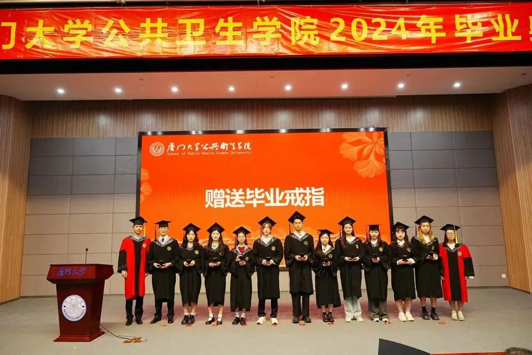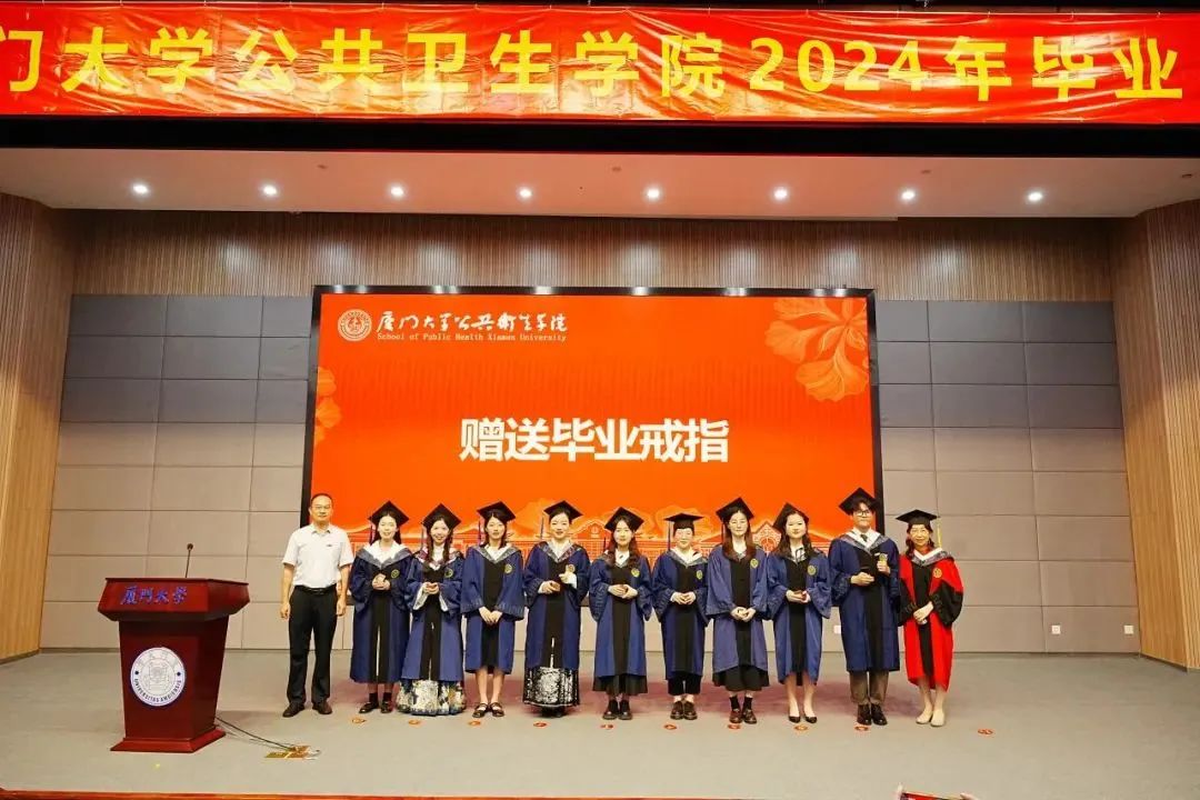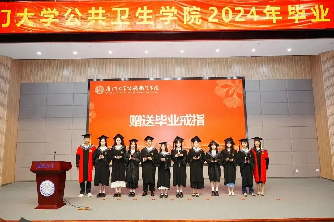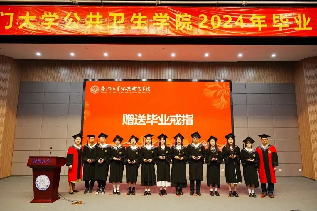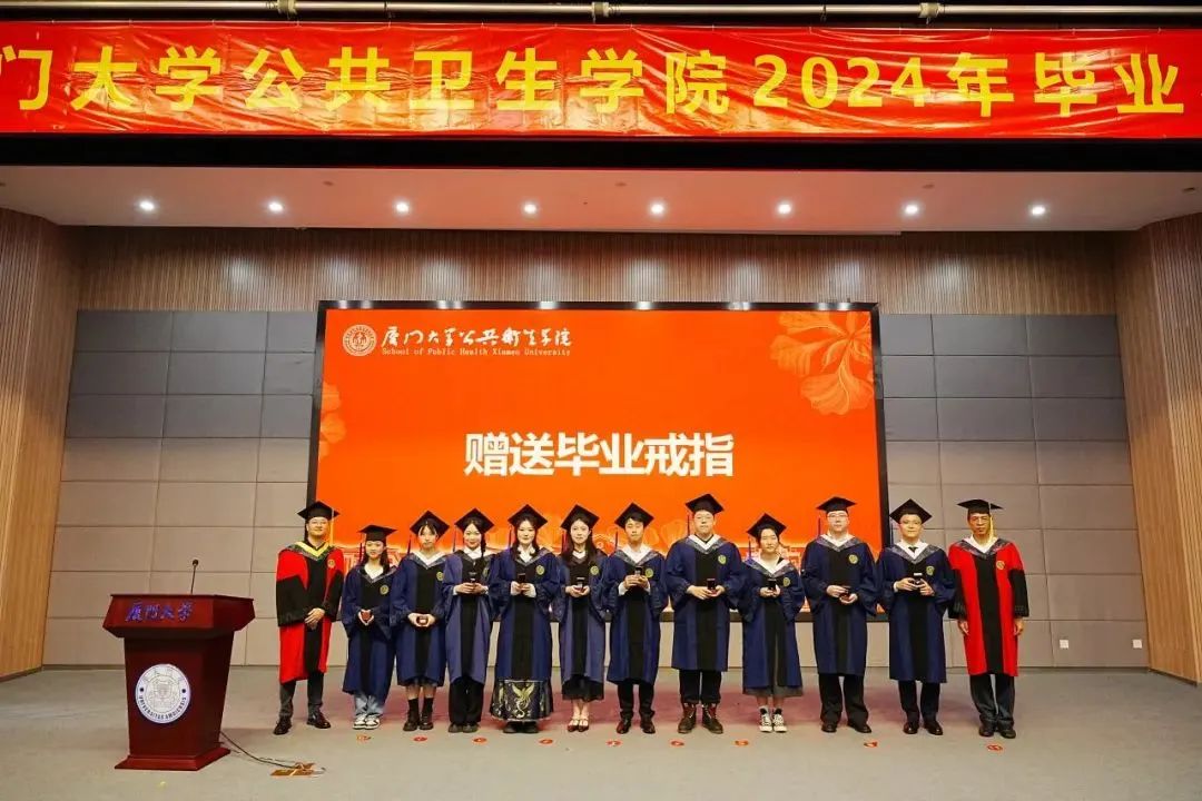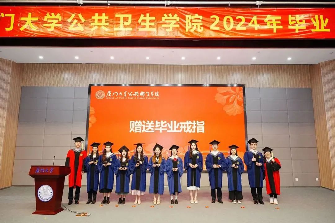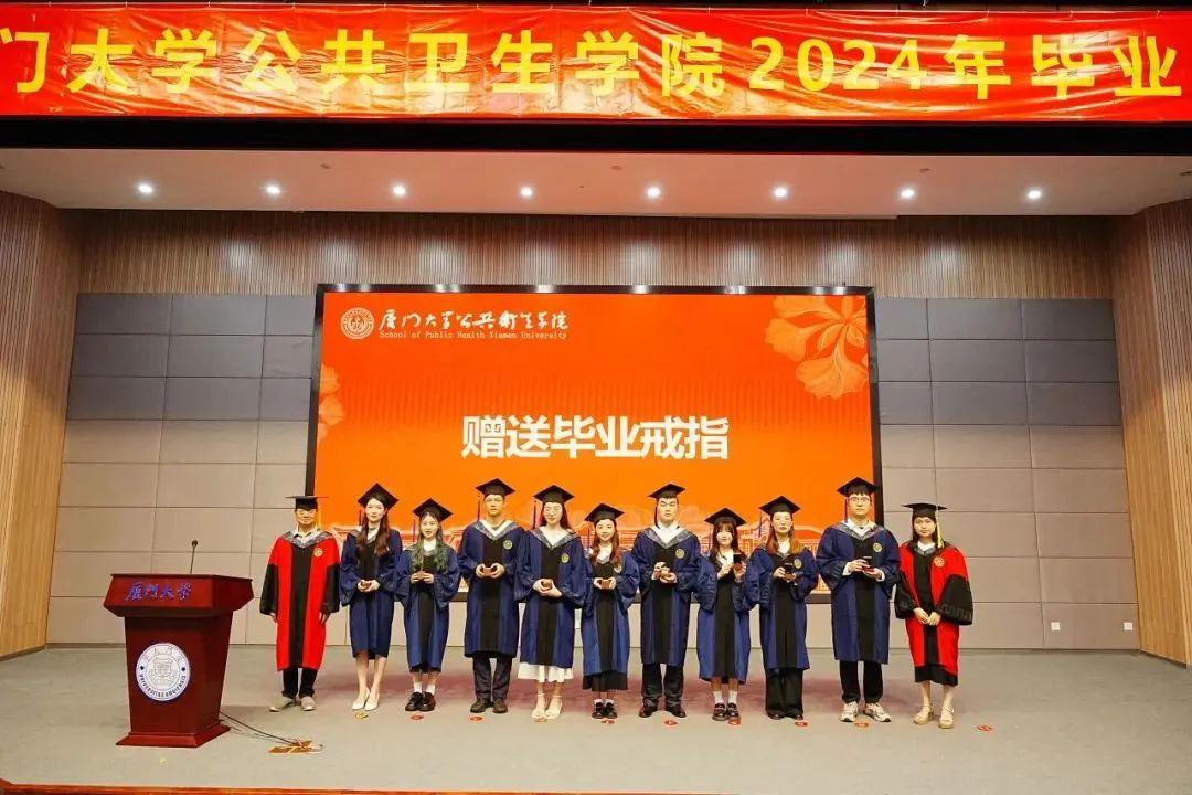 按照公共卫生学院的传统,学院为每一位毕业生准备了一枚精致的毕业戒指。老师们为毕业生们一一佩戴毕业戒指。同时,毕业生们也为学院准备了珍贵的礼物,本、硕、博的毕业生各赠送一棵凤凰木,栽种在学院曾宪梓楼北侧。