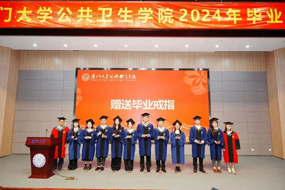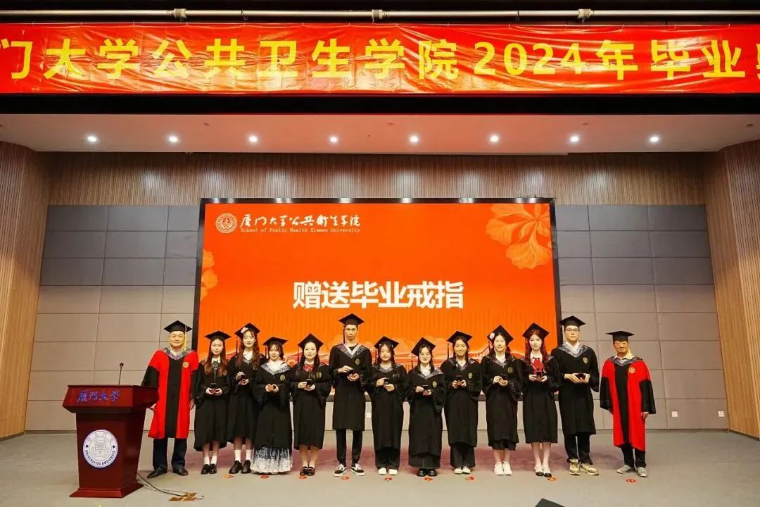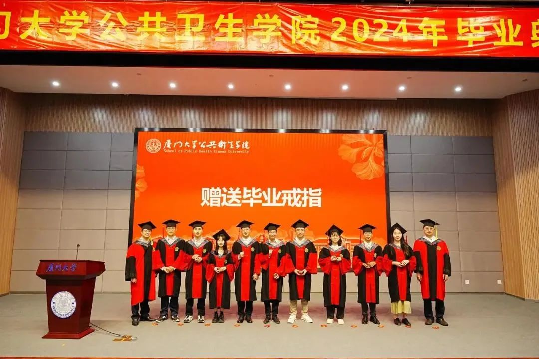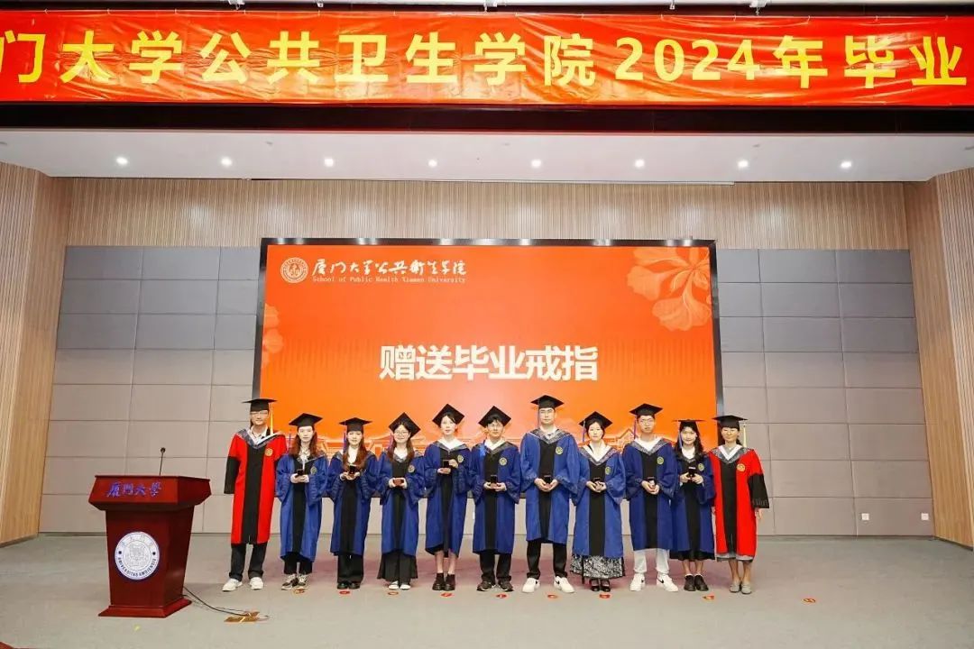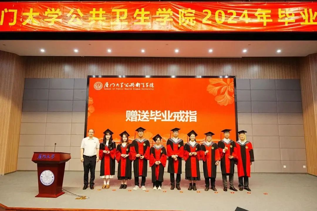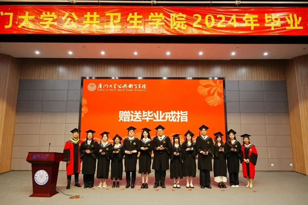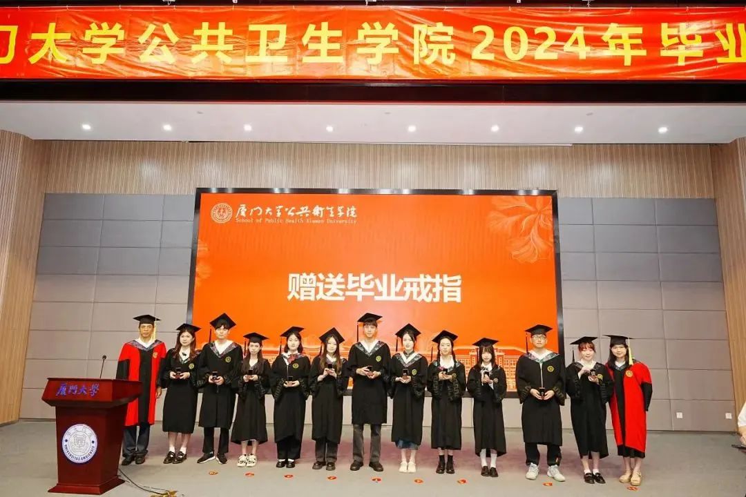 按照公共卫生学院的传统,学院为每一位毕业生准备了一枚精致的毕业戒指。老师们为毕业生们一一佩戴毕业戒指。同时,毕业生们也为学院准备了珍贵的礼物,本、硕、博的毕业生各赠送一棵凤凰木,栽种在学院曾宪梓楼北侧。