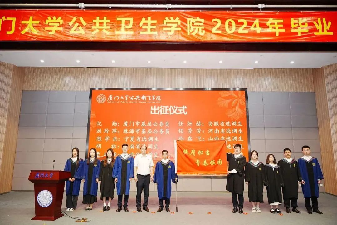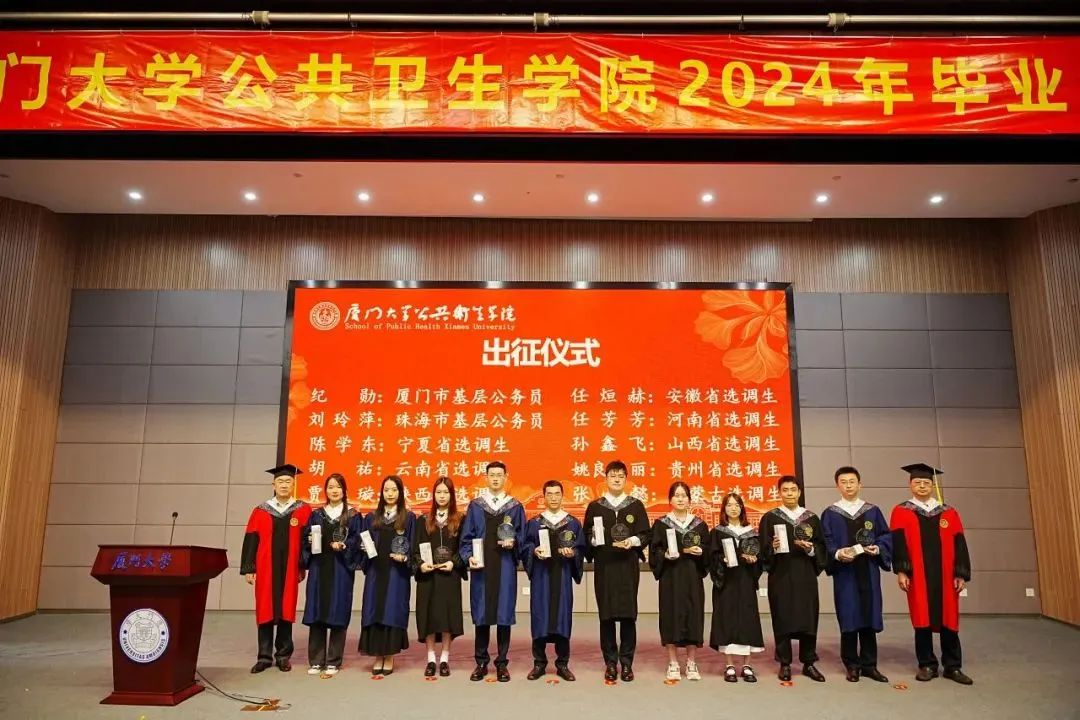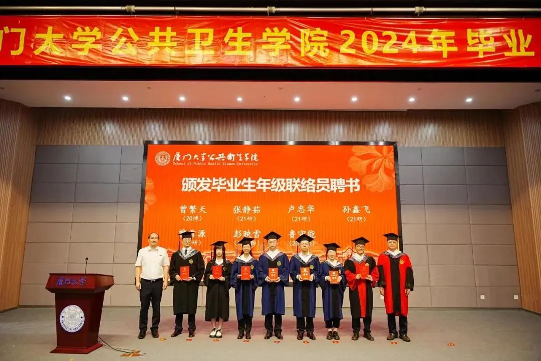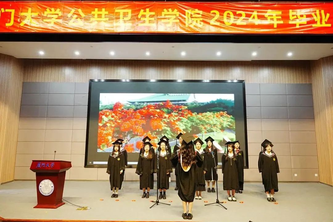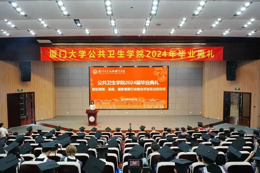 6月21日下午,公共卫生学院2024届毕业典礼暨赴西部、基层、国家重要行业就业毕业生出征仪式在翔安校区德旺图书馆2号报告厅举行。党委书记张琥、院长张军、学院第四届教授委员会主任滕伯刚、副院长刘刚、学院党委副书记刘君彬、预防医学系主任方亚、MPH中心主任苏迎盈、实验教学中心副主任张洁、实验医学系副主任王厚照、学院教职工代表和2024届全体毕业生出席本次典礼。典礼由党委副书记庄曦主持。