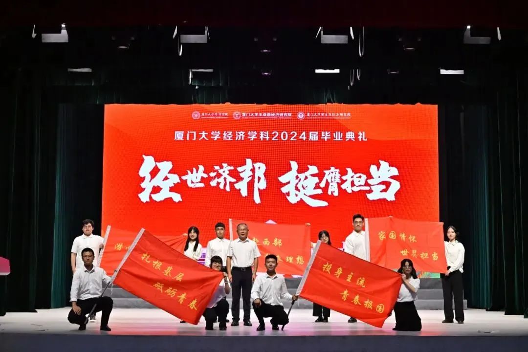 随后,典礼举行了2024届毕业生赴西部、基层、国家重要行业就业出征仪式。经济学院党委书记高忠华为毕业生代表授旗,并期望毕业生们在广阔的天地里大有作为,彰显厦大经济学子的时代担当。