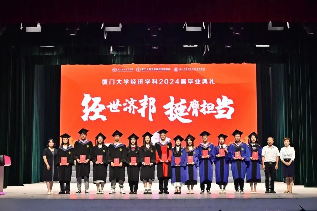 经济学科今年共授予124名学生“厦门大学2024届优秀毕业生”荣誉称号。经济学院副院长彭水军、经济学院副院长林明、王亚南经济研究院副院长陈海强为优秀毕业生代表颁奖并合影留念。