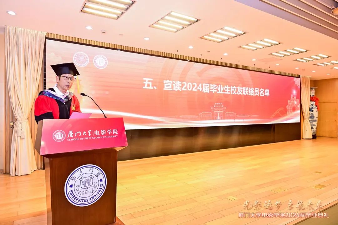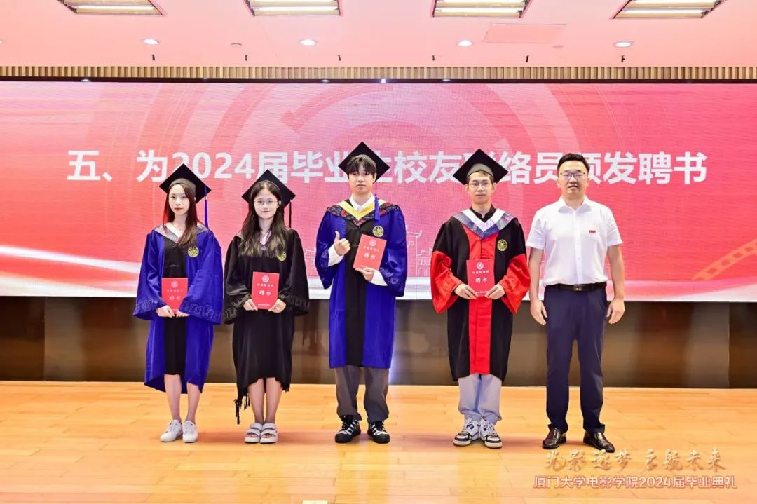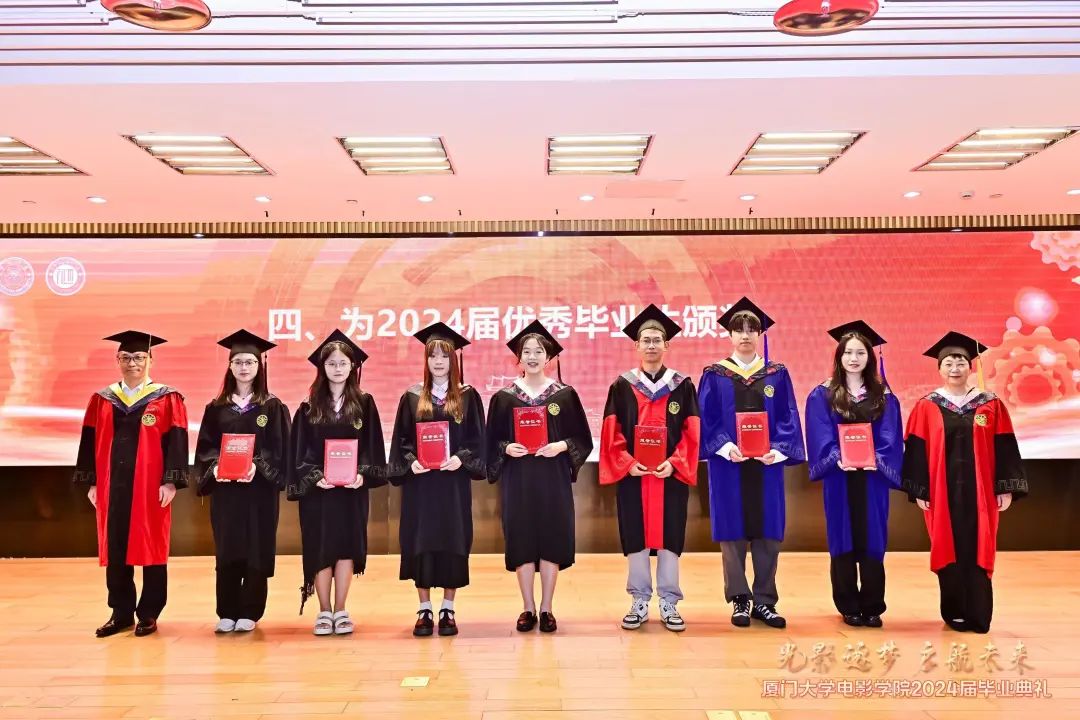 随后,林公明宣读了厦门大学2024届优秀毕业生电影学院名单,常务副院长李晓红、副院长姚俊峰为优秀毕业生颁发证书并合影留念。