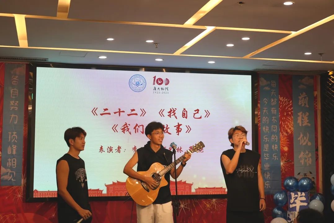在节目表演环节,师生代表纷纷登上舞台,为毕业生们带来精彩纷呈的演出。李明昊、何艺林、孟恺三位同学带来的《二十二》《找自己》《我们的故事》歌曲串烧,致敬那些共同经历的时光、走过的岁月。张鼎立演唱的《海阔天空》,用歌曲祝愿同窗好友们迎接更加广阔的天空。何浩冉带来的《陪你度过漫长岁月》,是对过往经历的深情告白。全体师生共同合唱《明天会更好》,祝愿所有毕业生通过不懈奋斗去开创更加美好的明天。