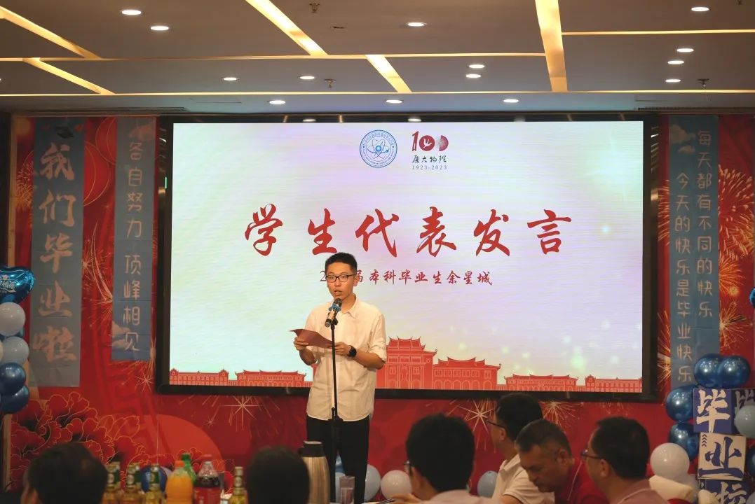 陈张海为毕业生们送上寄语,离开并不意味着结束,而是新的开始,同学们也将迎接更广阔的天地与机遇,希望毕业生们能够满载着在厦大的所学所得,不畏艰难险阻,敢为人先、敢于突破,创造属于自己的辉煌。